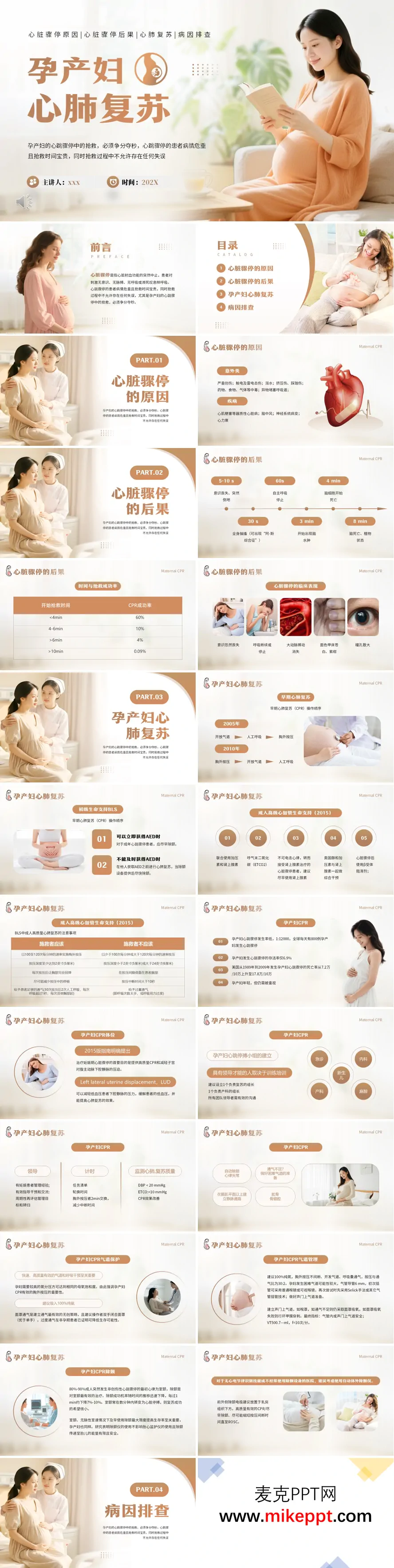 这套PPT的内容聚焦于孕产妇心脏骤停的抢救,标题为“孕产妇心肺复苏”。整套材料强调了孕产妇心跳骤停抢救的紧迫性、特殊性及其系统的临床应对流程。 文档首先明确了心脏骤停的定义,并系统性地分析了其原因,分为意外类(如创伤、溺水、中毒)和疾病类(如心肌梗塞、脑中风)。接着,详细阐述了心脏骤停后的后果,以时间轴形式展示了从意识丧失到脑死亡的病理生理过程,并附有一个关键数据表格,清晰显示了开始抢救时间与CPR成功率呈负相关,例如4分钟内抢救成功率可达60%,而超过10分钟则骤降至0.09%,这直观地论证了“争分夺秒”的必要性。 核心部分是关于孕产妇心肺复苏的专门指南。文档对比了2005年与2010年CPR操作顺序的变化,突出了胸外按压优先的原则。它详细列出了高质量CPR的注意事项,包括按压速率、深度、回弹等技术规范。特别重要的是,文档指出了孕产妇复苏的特殊性:为减轻子宫对下腔静脉的压迫,必须采用左侧子宫移位;由于生理变化,孕妇需要吸入100%纯氧;并建议建立多学科协作的抢救小组。 文档最后一部分是病因排查,列出了可能导致孕产妇心脏骤停的各种原因(如出血、肺栓塞、麻醉并发症等)及对应的处理思路。其中,濒死剖宫产 被作为一项关键抢救措施被强调,并给出了启动时机建议(如复苏4分钟未恢复自主循环应考虑)。文档以CPR的有效指标和中止指标作为结尾,构成了一个从识别、抢救到后续管理的完整知识闭环。