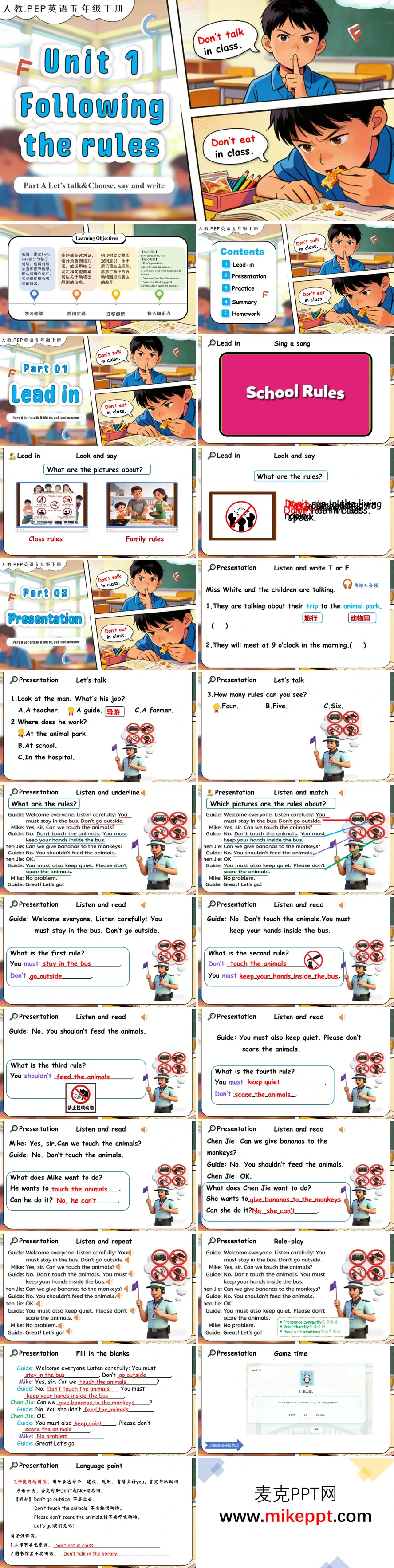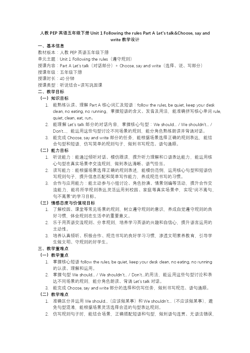 本课件为人教PEP五年级下册Unit 1《Following the rules》Part A Let's talk & Choose, say and write配套资源,教学环节紧凑有序。导入以歌曲营造氛围,通过班级与家庭规则场景激活已有经验,顺畅引入新课。新授阶段围绕动物园游览情境,运用听判、问答、跟读等多元策略,讲解核心祈使句及must/shouldn't等情态动词用法,配合角色扮演、情境填空、趣味游戏等活动强化语言实践。巩固环节设置分类书写、选择判断等任务,在语用中提升规则表达能力。课堂总结梳理知识框架,作业分层设计,涵盖基础跟读、家规创编及警示标志设计,兼顾个体差异与创新能力培养。整体设计契合五年级学生认知特点,情境真实,活动丰富,能有效促进学生规则意识与语言运用能力的协同发展。