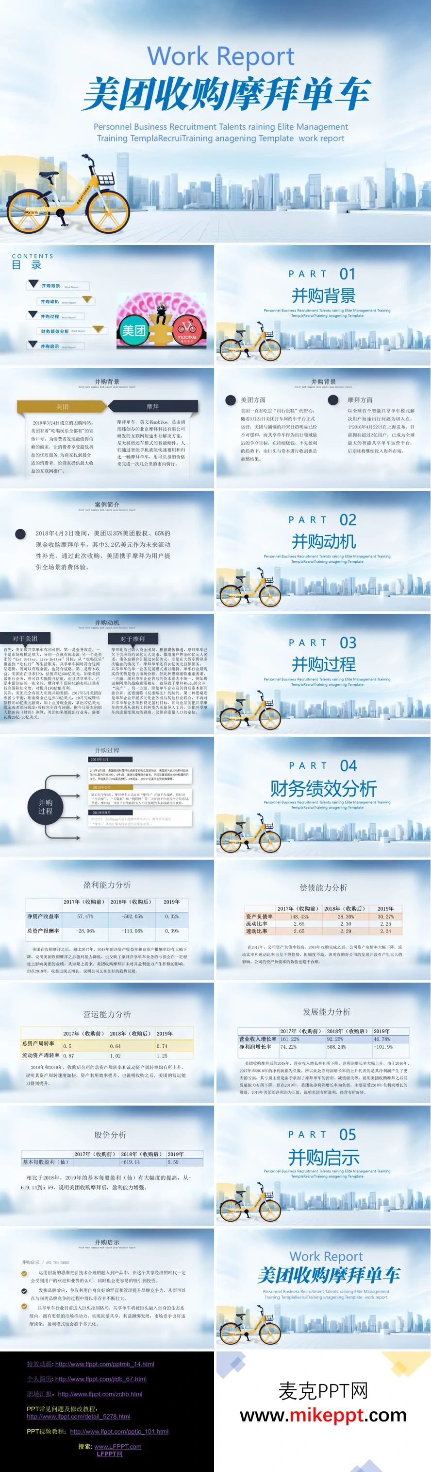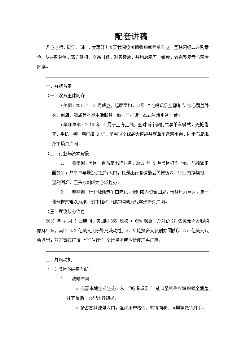 这是一份关于“美团收购摩拜单车”案例的工作报告PPT。这份PPT结构清晰,系统地阐述了此次并购事件的背景、动机、过程、绩效分析及启示。 PPT内容从“并购背景”开始,分别介绍了并购双方——以“吃喝玩乐”为核心的美团和以智能共享单车起家的摩拜。背景部分指出,美团有意拓展出行领域,而摩拜虽为行业龙头但面临资金困境。接着,“并购动机”部分从双方视角进行了分析:对美团而言,收购可完善其“吃住行”生态、获取现金流并提升IPO估值;对摩拜而言,则是摆脱债务危机、融入更大生态系统以获得生存发展。 “并购过程”部分以时间线形式,概括了从2018年4月达成协议、完成收购,到2019年美团App整合摩拜入口的关键步骤。“财务绩效分析”是报告的核心,通过多个财务比率表格,从盈利能力、偿债能力、营运能力、发展能力及股价五个维度,详细对比了2017年(收购前)、2018年(收购后)和2019年的数据。分析指出,收购短期内对美团的盈利和发展能力产生了负面影响,但长期看其营运能力得到提升,且2019年多项指标已显现好转趋势。 最后,“并购启示”部分总结了三点:一是创新与技术的融合是吸引用户和投资的关键;二是需通过提升品牌竞争力在市场中生存壮大;三是共享单车行业已进入巨头生态整合阶段,未来将更注重流量协同与多元化盈利。整体而言,这份PPT完整复盘了一次典型的互联网生态并购案例,兼具商业分析与战略思考。