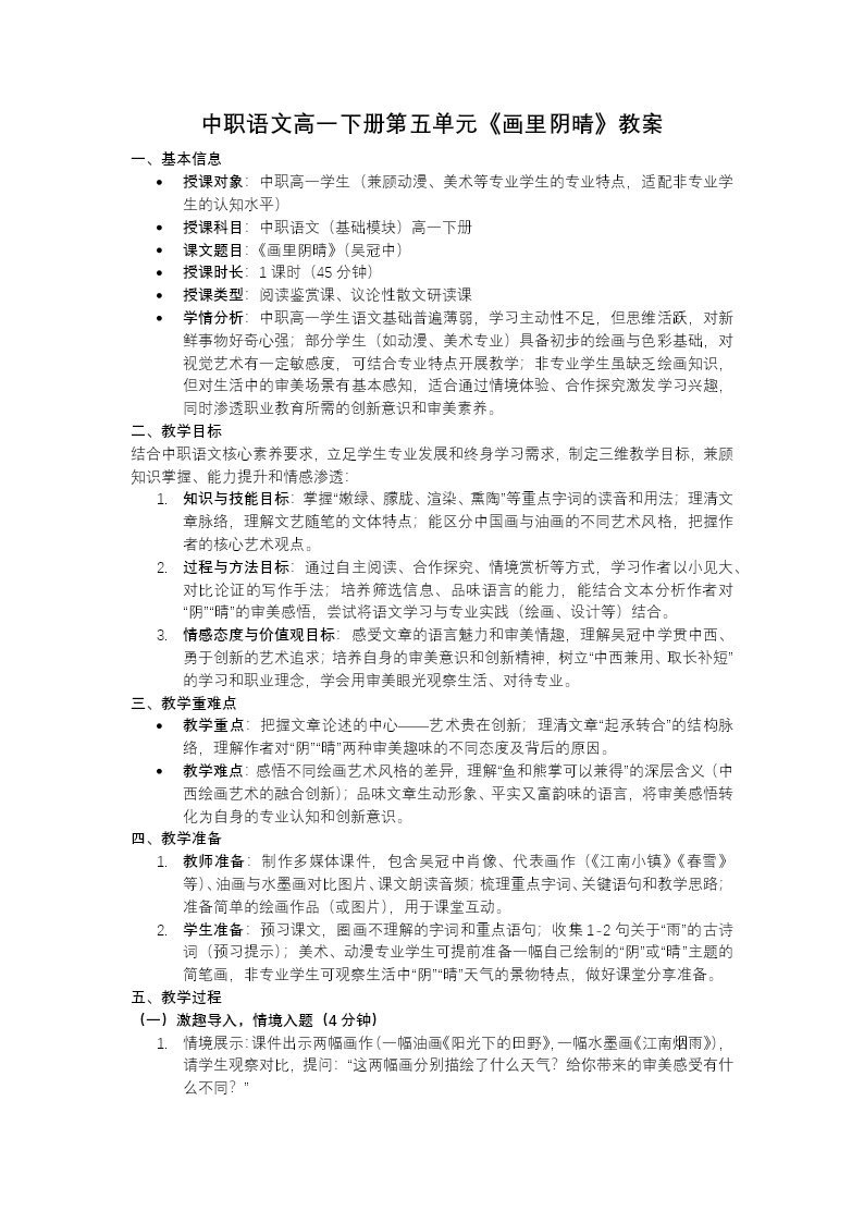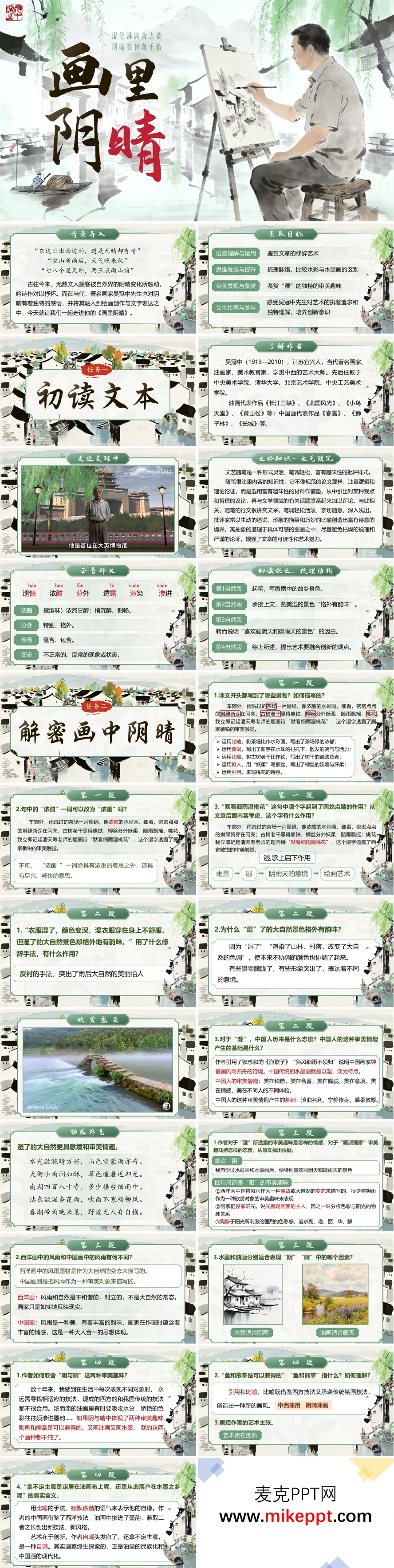 这是吴冠中文艺随笔《画里阴晴》语文教学课件,共31页,主题为"湿淋漓含古韵,阴晴交替蕴千情"。 开篇以诗句情景导入,明确语言鉴赏、思维提升、审美鉴赏、文化传承四大素养目标。第一部分初读文本,介绍作者吴冠中与文艺随笔文体知识,梳理生字词,拆解文章"总-分-总"结构,理清行文脉络。第二部分文本深度解读,逐段拆解:分析开篇雨景描写的修辞与作用,解读"湿"的审美意趣与中国人的审美传统;对比西洋画与中国画对风雨的不同态度,明确水墨适配阴、油画适配晴的特点;阐释吴冠中"中西兼容、阴晴兼画"的艺术主张,点明"艺术贵在创新"的核心主旨。第三部分总结艺术特色,提炼文章结构清晰、以小见大、语言平实生动的特点。最后总结全文,布置以"传承与创新""兼收并蓄"为主题的写作作业,引导学生深化对文艺发展的思考。
