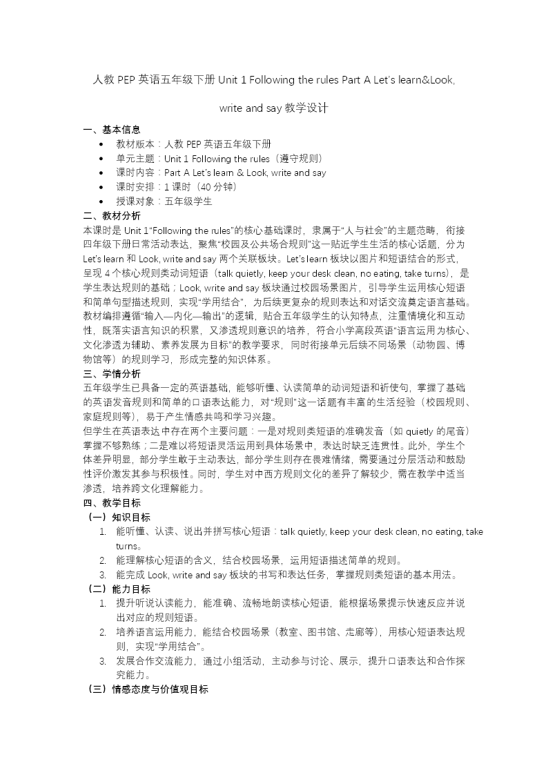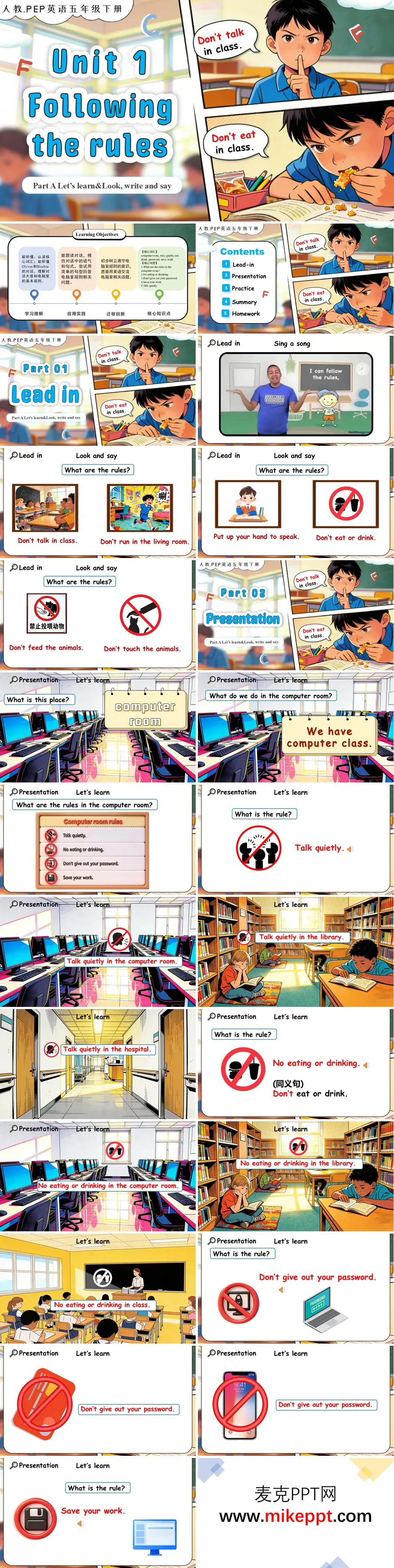 这是一套人教PEP五年级下册Unit 1《Following the rules》Part A Let's learn&Look, write and say的新授课件,聚焦电脑室等场景规则表达。开篇以趣味歌曲与场景问答热身,自然导入主题。新知环节围绕电脑室规则,系统讲解Talk quietly、No eating or drinking等核心句型,拓展图书馆、医院等多场景应用,同步拆解祈使句用法。练习部分设计匹配、填空、句型运用等分层训练,巩固知识;收尾以可视化图表梳理核心内容,构建知识框架。课后任务分层布置,兼顾基础跟读、能力提升与拓展延伸。整体画风童趣、互动性强,既落实语言教学,又渗透规则意识,可直接用于课堂。