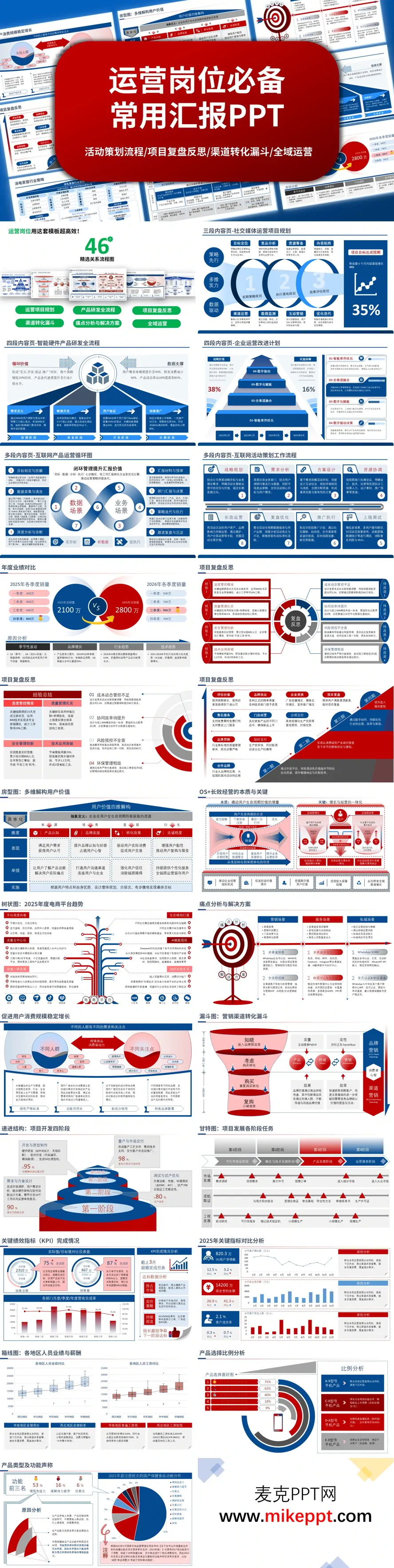 这是一套运营岗位全场景通用汇报PPT模板,采用蓝红商务配色,专业大气。模板覆盖运营全链路核心工作,包含46套精选关系流程图,涵盖活动策划、项目复盘、渠道转化漏斗、全域运营等核心模块,适配各类汇报需求。 内置丰富可视化图表,如年度业绩对比、KPI完成度、营销转化漏斗、用户价值拆解、痛点分析等,直观呈现数据逻辑。同时覆盖电商、互联网、AI、医疗、数码家电等多行业场景,适配产品研发、用户运营、活动策划、渠道分析等全流程工作,还包含企业生命周期、数字化转型等进阶内容,满足不同层级运营人需求,助力高效完成专业汇报。