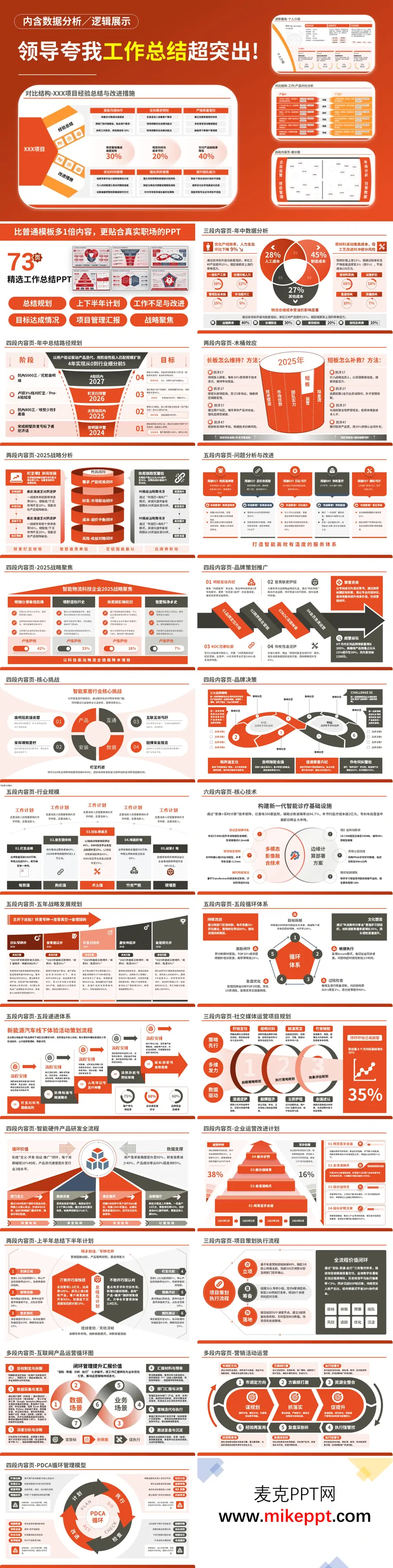 这是一套职场全场景通用工作总结汇报PPT模板,采用暖橙红商务配色,醒目大气。内容量远超普通模板,高度贴合真实职场需求,助力打造突出汇报效果。 模板内含73+精选可视化图表,覆盖工作总结全链路:总结规划、上下半年计划、工作不足与改进、目标达成、项目管理、战略聚焦等核心板块,适配年度/半年度/季度汇报、项目复盘、述职报告等各类场景。 内置丰富逻辑图表,如战略分析、问题拆解、流程推进、数据可视化、鱼骨图、漏斗图、甘特图等,直观呈现成果与逻辑。同时覆盖互联网、电商、AI、医疗、实体等多行业场景,适配运营、产品、研发、管理等多岗位,可直接套用修改,高效完成专业汇报。