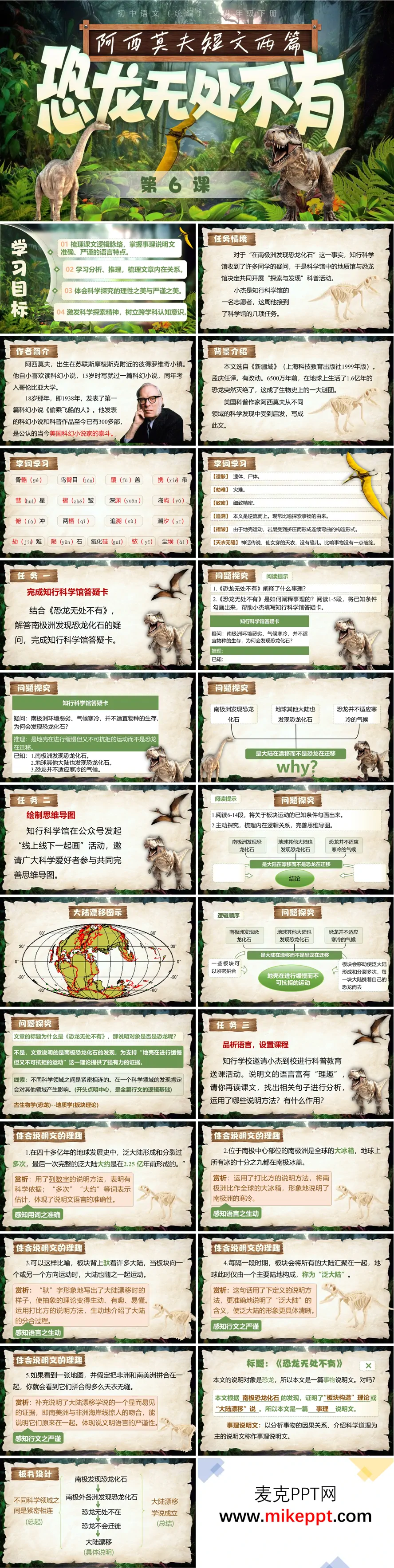 这是初中语文统编八年级下册《阿西莫夫短文两篇》之《恐龙无处不有》教学课件,共32页,以丛林恐龙为视觉主题,风格生动贴合科普文特质。 开篇明确学习目标,涵盖梳理逻辑、品析语言、体会科学精神等维度,介绍作者阿西莫夫与文章背景,夯实骨骼、褶皱等字词基础。核心内容围绕三大任务展开:一是完成科学馆答疑卡,以"南极洲发现恐龙化石"为核心疑问,通过逻辑推理推导得出"大陆漂移"而非恐龙迁徙的结论,厘清文章核心事理;二是绘制思维导图,梳理文章逻辑链条,结合大陆漂移图示,拆解"从恐龙化石到板块构造理论"的推理过程,明确文章逻辑顺序;三是品析说明文语言,赏析列数字、打比方、作比较等说明方法,分析"驮""大约"等词句,体会说明文准确、生动、严谨的语言特点,区分事理说明文与事物说明文。