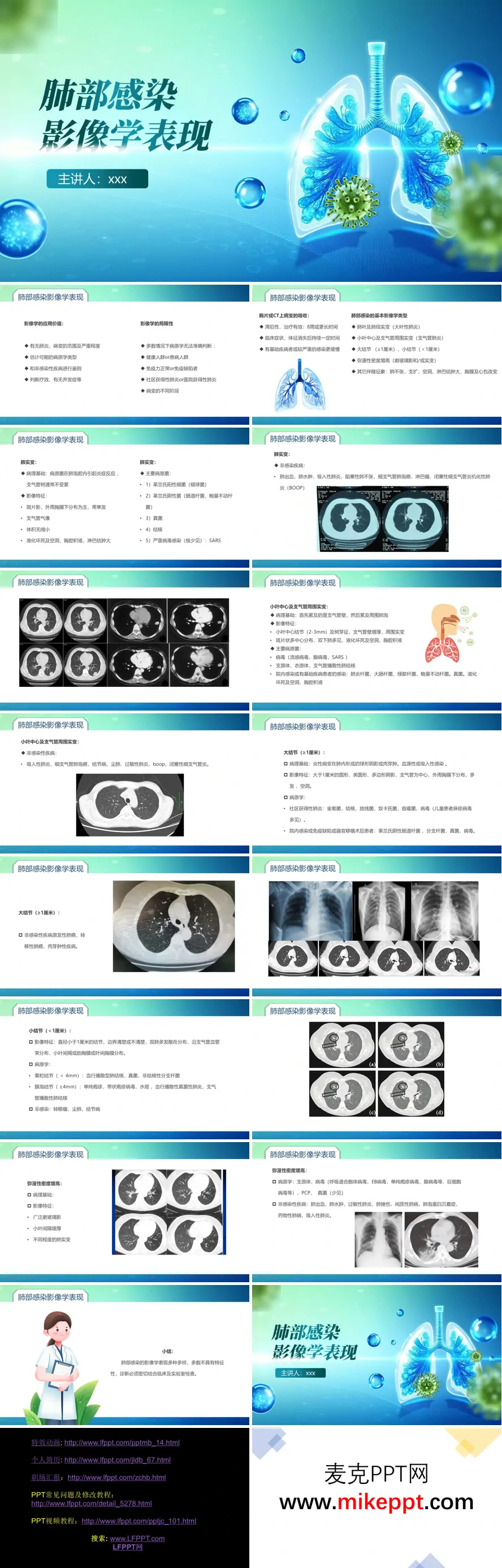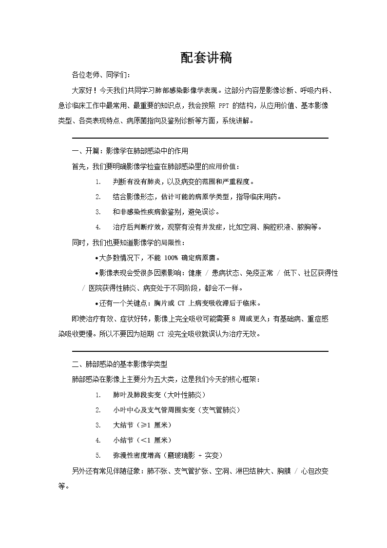 这套PPT的标题是“肺部感染影像学表现”,其核心内容围绕肺部感染在影像学(主要是胸片和CT)上的各种表现类型、各类征象的病理基础、对应的常见病原体以及需要与之鉴别的非感染性疾病展开。 PPT首先概述了影像学在肺部感染诊疗中的应用价值,例如判断有无肺炎、评估病变范围和严重程度、辅助鉴别病原体类型、与非感染性疾病区分,以及监测疗效和并发症。同时,它也客观指出了影像学的局限性,特别是多数情况下无法准确判断具体病原体,因为相同的影像表现可出现在不同人群(如健康者与免疫缺陷者)、不同感染类型(社区获得性与医院获得性)以及病变的不同阶段。此外,PPT强调影像学上病变的吸收常滞后于临床表现,有效治疗下病灶完全吸收可能需要8周或更长时间,尤其对于有基础疾病或严重感染的患者会更缓慢。 文档的主体部分系统性地介绍了肺部感染的几种基本影像学类型,并对每种类型进行了详细解析: 1.肺叶及肺段实变(大叶性肺炎):病理基础是病原菌引发的肺泡腔内炎症,影像特征以斑片状实变、外周胸膜下分布、常见“支气管气像”为主。常见病原体包括链球菌、肠道杆菌、鲍曼不动杆菌、真菌和结核等,严重病毒感染如SARS也可能引起。需要与肺出血、肺水肿、肺癌等非感染性疾病鉴别。 2.小叶中心及支气管周围实变(支气管肺炎):病理基础始于支气管壁炎症,继而累及周围肺泡。影像上表现为小叶中心结节、“树芽征”、支气管壁增厚及周围斑片状实变,多分布于双下肺。常见病原体包括病毒(流感病毒、腺病毒、SARS)、支原体、衣原体以及支气管播散性肺结核。院内感染或有基础疾病的患者还常见肺炎杆菌、绿脓杆菌等。 3.大结节(≥1厘米)与小叶结节(<1厘米): ◦大结节:通常为圆形或类圆形,可多发,常见空洞。社区感染多见于金黄色葡萄球菌、结核、真菌等;院内或免疫缺陷患者则需考虑革兰氏阴性杆菌、分支杆菌、真菌及病毒。 ◦小结节:根据大小和分布进一步区分。粟粒样小结节(<4mm)多见于血行播散型肺结核或真菌感染;腺泡结节(≥4mm)则可能与疱疹病毒、水痘病毒或血行播散的真菌感染有关。 4.弥漫性密度增高:影像特征包括广泛的磨玻璃影、小叶间隔增厚伴不同程度实变。常见病原体包括支原体、多种病毒(如呼吸道合胞病毒、腺病毒、巨细胞病毒等)以及耶氏肺孢子菌(PCP)。需要与肺水肿、间质性肺病、肺泡蛋白沉着症等多种非感染性疾病鉴别。 PPT在最后进行总结,明确指出肺部感染的影像学表现多样且多数不具备病原特异性,诊断必须紧密结合临床表现和实验室检查。 关于PPT中的图片内容,文档文本中提及了多张示意图或CT影像的标注(例如“P 185 W:1200 L:-700”是CT图像的窗宽窗位参数),这些图片直观展示了上述各种影像学表现,如肺实变中的“支气管气像”、小叶中心病变的“树芽征”、大小结节的形态、以及弥漫性磨玻璃密度影等典型征象。图片与文字内容相辅相成,共同构成了对肺部感染影像学表现的全面介绍。