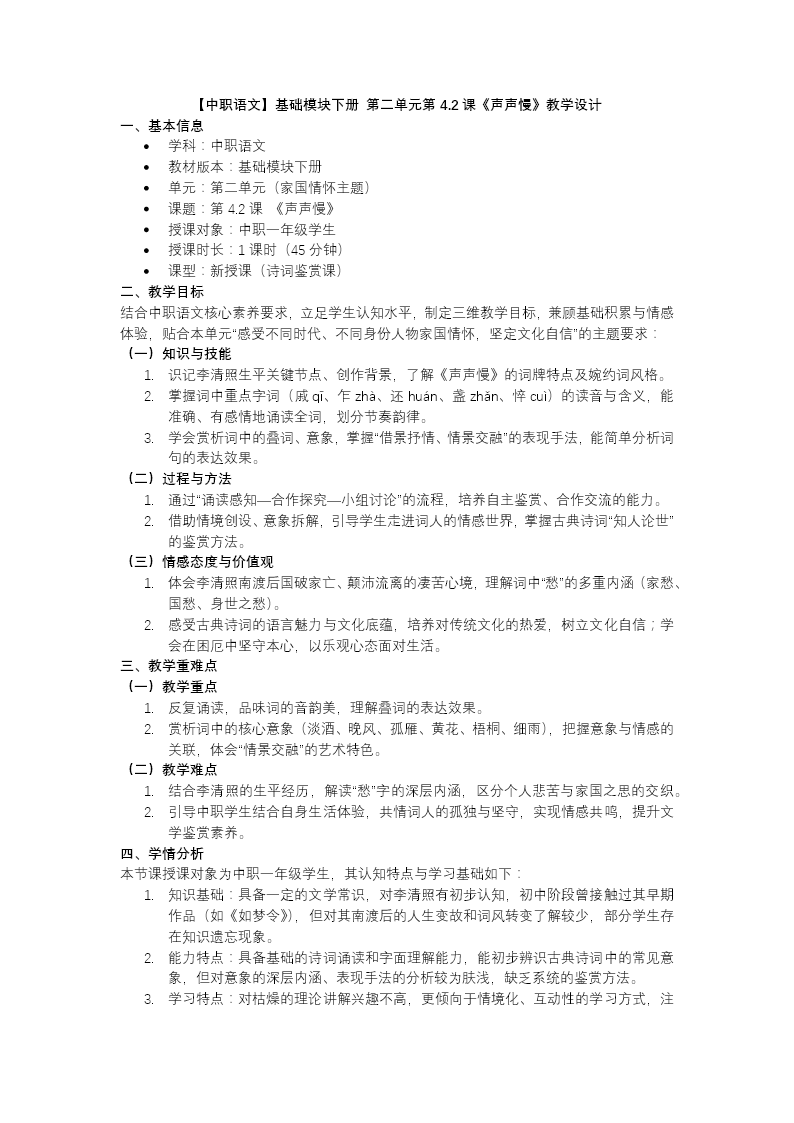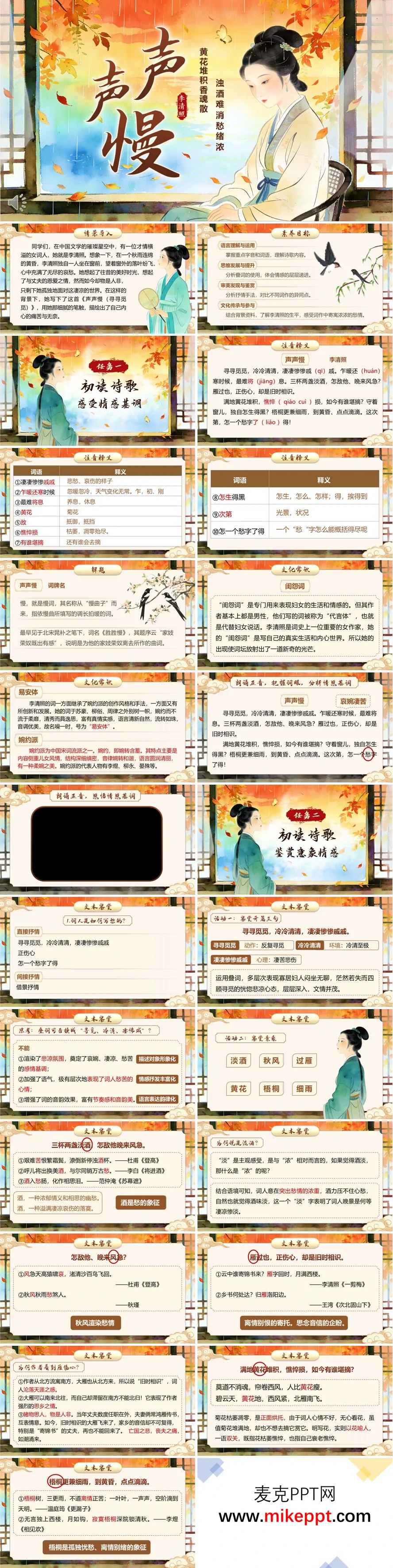 这套课件以国风秋意为视觉基调,完整呈现李清照《声声慢》教学内容。开篇情境导入营造氛围,明确语言运用、审美鉴赏等核心素养目标。 任务一:初读入门。 校正字音,解析"声声慢"词牌渊源,讲解闺怨词传统与"易安体"艺术特色,引导学生把握凄婉低沉的情感基调。 任务二:意象品读。 逐句赏析叠词开篇的音乐美,解读淡酒、秋风、过雁、黄花、梧桐细雨等核心意象,分析直抒胸臆与借景抒情的交织运用,穿插李清照南渡生平,深味家国之悲与孀居之苦。 任务三:比较鉴赏。 联动《醉花阴》《虞美人》等词作,辨析词人早中晚期"愁"情的内涵差异与意象选择变化。 任务四:巩固拓展。 设计文言落实练习与情境写作任务,实现读写迁移。 全课件从文本细读到知人论世,从意象分析到对比鉴赏,层层深入,既重语言品味,又重情感体悟,可直接服务于中职语文课堂教学。