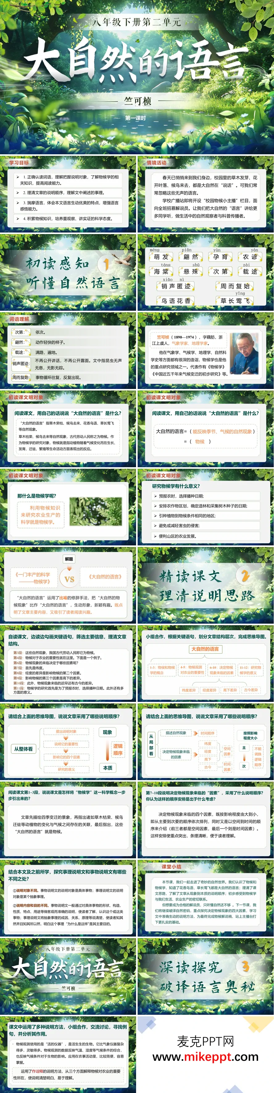 这是八年级下册语文《大自然的语言》教学课件,共36页,以清新的绿意为主色调,契合说明物候学的主题,整体分为三课时核心内容。 初读感知"听懂自然语言":开篇通过生活实例导入,介绍作者竺可桢,重点梳理"大自然的语言"指代物候现象,解读萌发、次第等字词,探究物候学概念,区分"一门严密的科学——物候学"与"大自然的语言"的关系,明确研究物候学的意义。 精读课文"理清说明思路":引导学生梳理文章逻辑,分析说明顺序(从整体到局部、从主到次),探讨举例子、列数字等说明方法的运用,对比文章与说明文、事物说明文与事理说明文的差异,明确本文是阐释事理的说明文。 研读探究"破译语言奥秘":深入分析文中说明方法的表达效果,结合语句赏析说明语言准确、生动的特点,同时梳理课堂内容,布置阅读名著、拟写标语等作业,实现知识巩固与拓展。