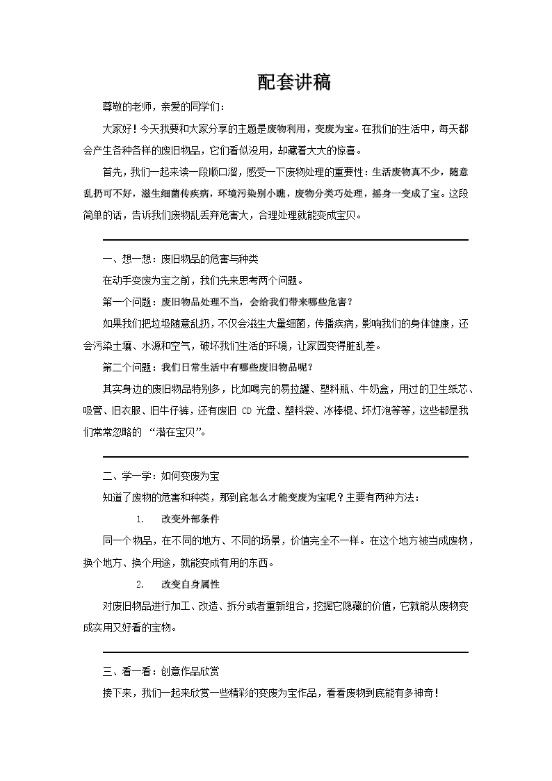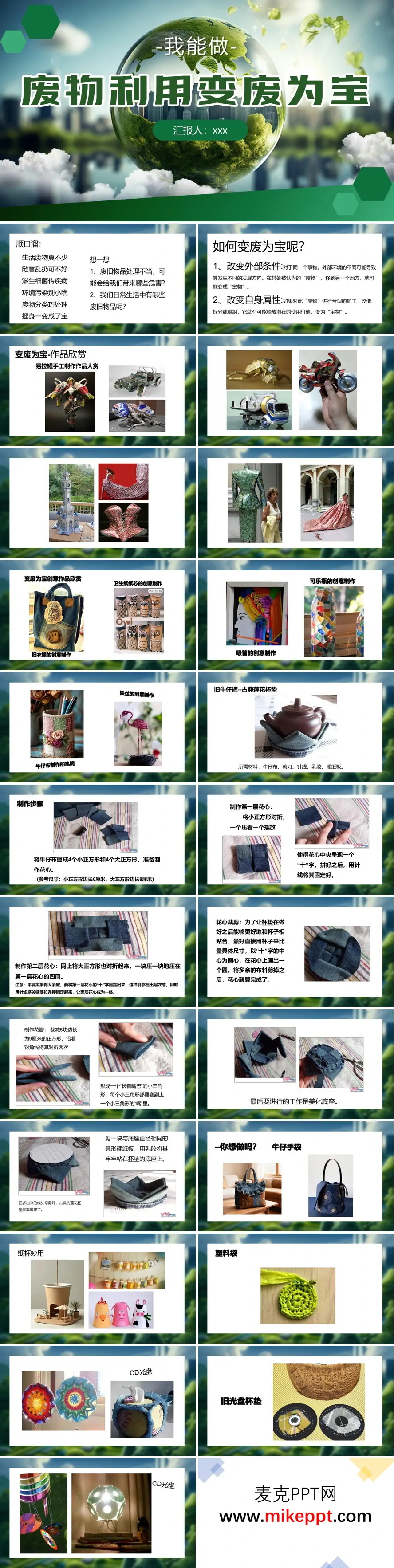 这套PPT以“废物利用,变废为宝”为主题,通过图文并茂的形式,系统性地介绍了废旧物品再利用的理念、方法和创意实践。整体内容结构清晰,从提出问题、阐述方法,到展示丰富的手工作品,最后引导实践,形成了一个完整的宣传教育闭环。 PPT的开头部分通过顺口溜和思考题,生动地指出了生活垃圾不当处理的危害,并引导观众思考身边的废旧物品,从而引出核心主题。接着,PPT从宏观方法论层面提出了“变废为宝”的两大途径:一是通过改变外部条件(即让物品在不同场景中发挥不同价值),二是通过改变自身属性(即对物品进行物理改造),观点简明扼要。 PPT的核心与精华在于其海量的“作品欣赏”部分,这部分通过大量实物图片,直观、丰富地展示了如何将各种废旧物品转化为实用或装饰性手工艺品。具体展示的创意改造案例覆盖了极其广泛的材料类型,包括:易拉罐(被制作成复杂的模型)、旧衣物(如制作牛仔布杯垫和手袋)、卫生纸纸芯、塑料瓶(被改造为盆栽、首饰盒甚至窗帘)、吸管、铁丝、旧光盘(制作成杯垫)、灯泡、纸杯以及塑料袋等。每一类材料都配有最终成品的图片,部分复杂作品(如“古典莲花杯垫”)还分步骤配图详解了制作过程,极具参考性和启发性。 结尾部分,PPT布置了利用废旧物品制作作品的实践作业,并提出了课后扩展思考,鼓励观察生活、探索更多方法,最终以“我能做”的口号强化主题,号召观众积极参与到变废为宝的环保行动中。整体而言,这套PPT是一份内容充实、案例生动、极具实践指导意义的环保教育与手工制作教学材料。