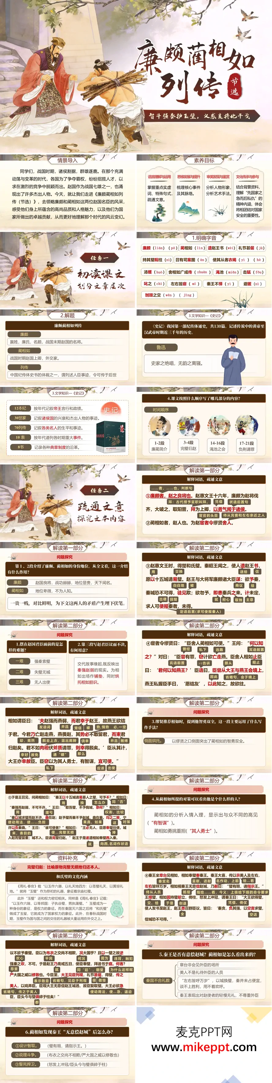 这套课件以国风历史插画为视觉基调,系统呈现《史记·廉颇蔺相如列传》教学内容。开篇以战国纷争情境导入,明确语言建构、思维发展等核心素养目标。 任务一:基础梳理。 校正字音,解析列传体例,讲解《史记》纪传体特征与文学地位,划分"完璧归赵""渑池之会""负荆请罪"三大事件层次。 任务二:文意疏通。 逐段精读,落实重点实词、虚词用法与特殊句式,通过问题链探究完璧归赵的智勇交锋、渑池会的针锋相对、将相和的胸襟气度,深化文本理解。 任务三:人物鉴赏。 分析蔺相如智勇双全、顾全大局的谋士形象,廉颇忠勇善战、勇于改过的武将风骨,解读对比衬托手法,领悟"先国家之急而后私仇"的精神内核。 任务四:知识巩固。 梳理通假字、词类活用等文言现象,总结叙事曲折、写人生动的艺术特色,配套"将相和"主题辩论与分层检测。 全课件史文结合、文道统一,既夯实文言基础,又涵养家国情怀,可直接服务于中职语文课堂教学。