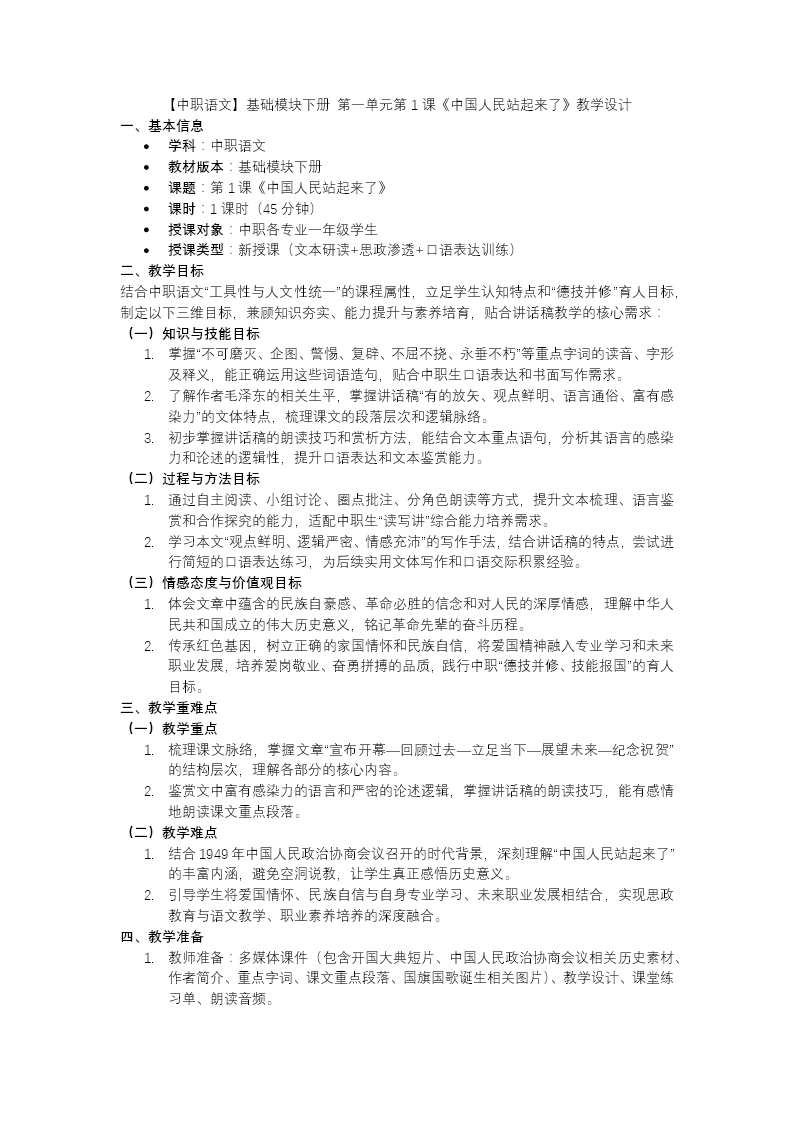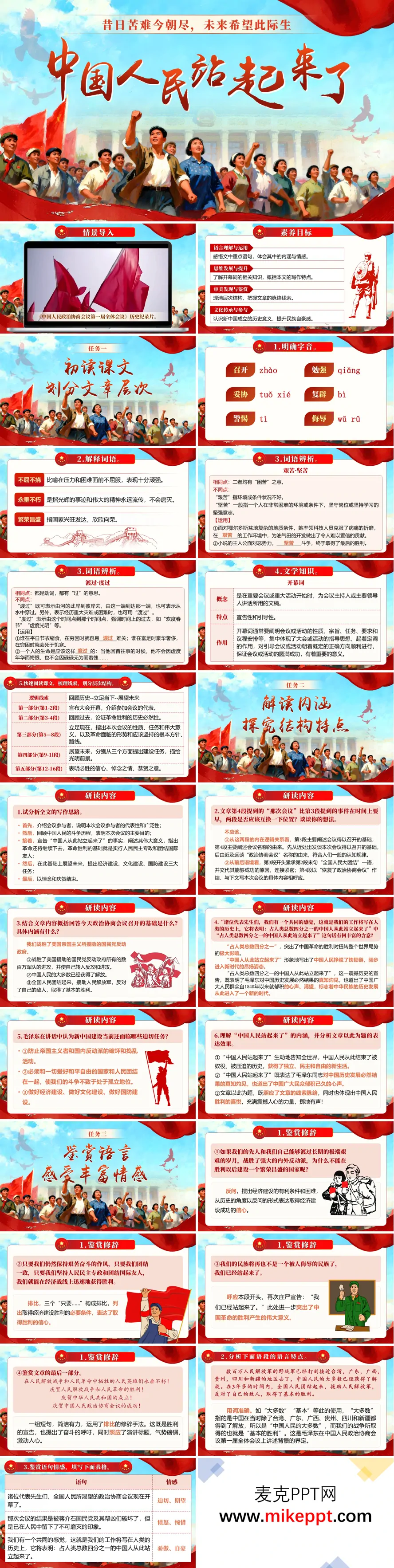 这套《中国人民站起来了》PPT采用递进式教学结构,层层深入展开教学。开篇通过情景导入明确素养目标,奠定学习基调。任务一侧重基础积累,梳理字音字词、文学常识,引导学生划分层次、搭建框架。任务二深入文本解读,探究写作思路、段落逻辑与核心内涵,理解"站起来了"的深刻意义。任务三聚焦语言鉴赏,分析反问、排比等修辞手法,借助情感脉络表体会文章磅礴气势。任务四结合时代背景与毛泽东生平,链接"站起来—富起来—强起来"的历史进程,升华主题认知。最后总结艺术特色,布置主题演讲作业,实现从文本理解到现实迁移的完整闭环,全面覆盖中职语文教学要求。