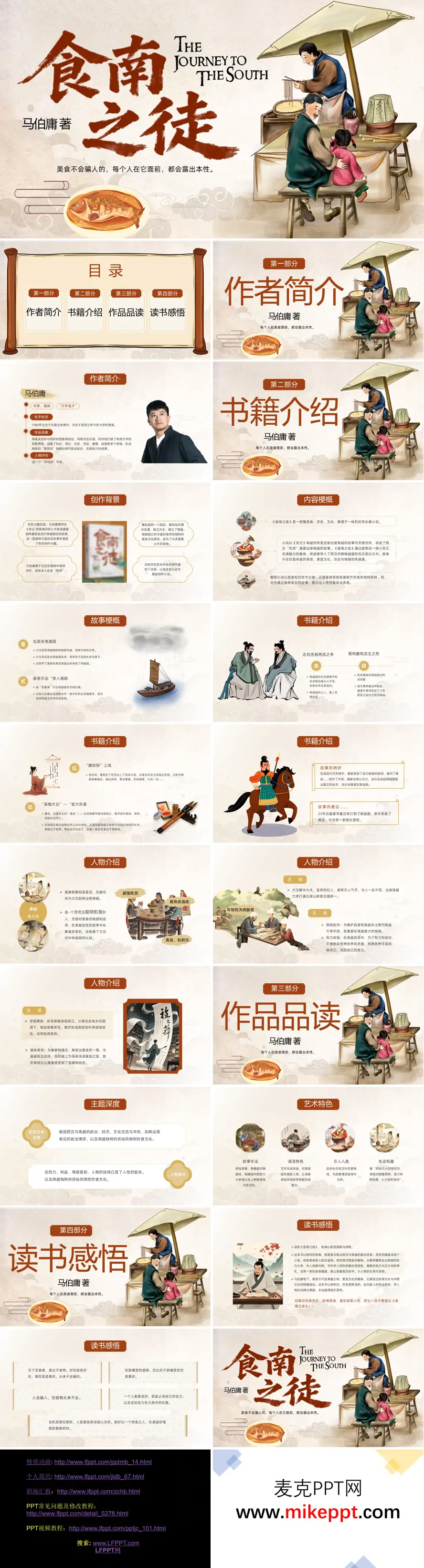 这套PPT以马伯庸所著小说《食南之徒》为核心,通过清晰的图文结构展现了书籍的多个维度。 内容主体分为四个部分,逻辑清晰: 1.作者简介:这部分展示了作家马伯庸的照片、称号(“文字鬼才”)及其生平。图片与文字结合,简要说明了他的教育背景、创作风格(融合史料与想象,跨越多种题材的“混搭风”)以及外界评价。 2.书籍介绍:这是PPT的核心部分,篇幅最长。它通过分点叙述和关键情节插图,系统介绍了小说的创作背景(源于《史记》中唐蒙与枸酱的记载)、内容梗概(西汉“吃货”唐蒙出使南越的故事主线),并梳理了从“出发去南越国”到“23年后复仇”的完整故事脉络。图片的选用多与情节关键点(如嘉鱼、蜀枸酱、人物冲突场景)相配合,增强了叙事性。此外,还以图文形式介绍了四位主要人物(唐蒙、庄助、吕嘉、甘蔗),突出了各自的性格特征与在故事中的角色定位。 3.作品品读:此部分通过提炼出的关键词和象征性图片,分析了作品的主题深度(历史文化呈现、人性探讨)和艺术特色(多线叙事、生动诙谐的语言,特别是对美食的细致描写),帮助观众理解小说的文学价值。 4.读书感悟:最后部分以总结性文字和富有哲理的书中金句(如“天下至真者,莫过于食物”、“人会骗人,但食物从来不会”)收尾,强调了阅读本书带来的关于历史、文化与人性的思考,并起到了推荐阅读的作用。 总的来说,这套PPT并非简单罗列文字,而是通过精选的图片、清晰的章节划分和凝练的文字摘要,有效地将一部长篇小说的精华——包括其背景、故事、人物、特色与内涵——进行了可视化呈现,使观看者能够快速把握《食南之徒》一书的整体风貌与核心魅力。