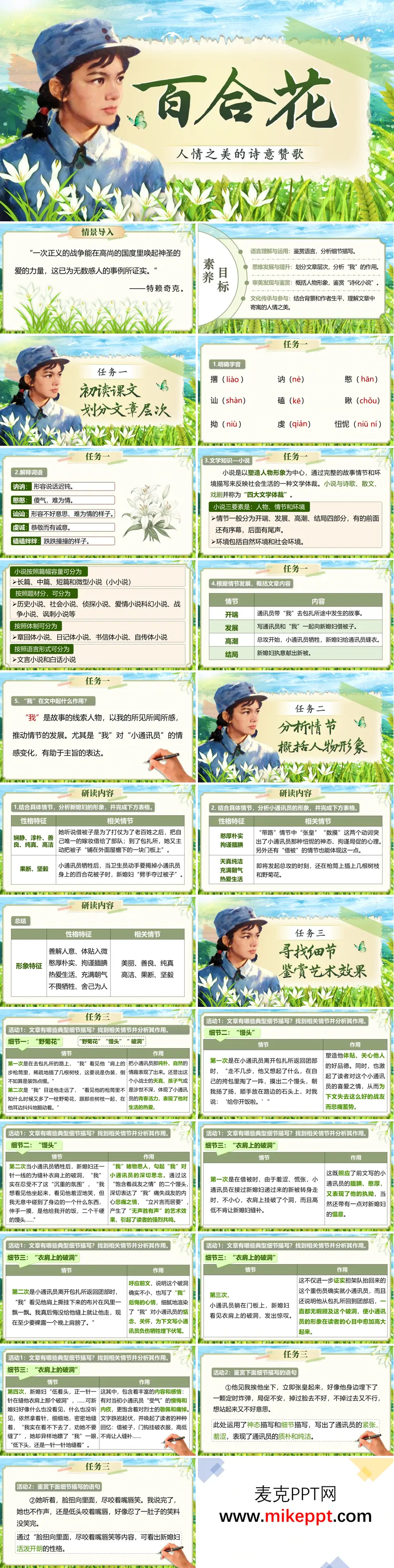 这套《百合花》PPT采用递进式教学结构。开篇以名言导入情境,明确素养目标。任务一夯实基础,梳理字词、小说文体知识,引导学生理清情节脉络,明确"我"的线索作用。任务二深入人物分析,结合具体情节剖析新媳妇与小通讯员的性格特征,完成形象梳理表。任务三聚焦细节鉴赏,围绕"野菊花""馒头""衣肩破洞"等典型意象,解读其艺术效果与情感内涵,分析称呼变化的作用。任务四把握文体特色,解析"诗化小说"特点,对比一般战争小说,总结以小见大、细节贯穿等手法,结合茹志鹃生平解读"百合花"的象征意义。任务五拓展同类文本对比阅读,以细节描写写作作业收尾。整体设计由浅入深,从文本解读到写作实践,层层递进,完整覆盖中职语文教学要求。