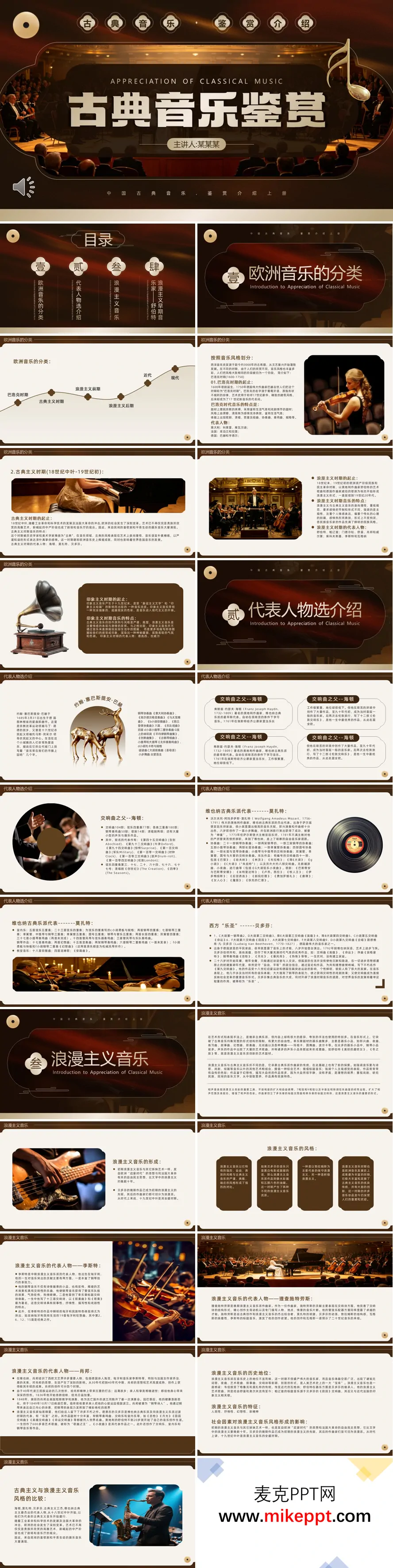 这套PPT是一份关于古典音乐鉴赏的演示文稿,主要内容围绕古典音乐的发展历史、主要风格流派及代表性作曲家展开。 文档的主体内容首先对欧洲音乐史进行了分期介绍,按照音乐风格划分为巴洛克时期、古典主义时期、浪漫主义时期和印象主义时期,并概述了每个时期的起止时间、音乐特点及代表作曲家。例如,巴洛克时期以巴赫、亨德尔为代表,音乐充满活力与装饰性;古典主义时期以海顿、莫扎特、贝多芬为核心,崇尚理性与形式严谨;浪漫主义时期强调个人情感与民族风格,代表人物包括舒伯特、肖邦、李斯特等;印象主义时期则以德彪西、拉威尔为代表,注重气氛与色彩的渲染。 随后,PPT选取了多位重要作曲家进行详细介绍,包括巴赫、海顿、莫扎特、贝多芬、舒伯特、李斯特、理查·施特劳斯、肖邦等。对每位作曲家的生平、代表作、音乐贡献及历史地位都进行了阐述。例如,将海顿称为“交响曲之父”,列举了他的多部交响曲和清唱剧;详细列出了莫扎特在歌剧、协奏曲、室内乐等领域的庞大作品目录;突出贝多芬从古典到浪漫的桥梁作用及其“乐圣”地位;用专门章节介绍舒伯特作为浪漫主义早期音乐家和“歌曲之王”的成就与创作风格。 整体来看,这份PPT内容结构清晰,从宏观的音乐史分期到具体的作曲家个案,系统地介绍了古典音乐的发展脉络、艺术特征与关键人物,旨在为古典音乐鉴赏提供一个概括性的知识框架。