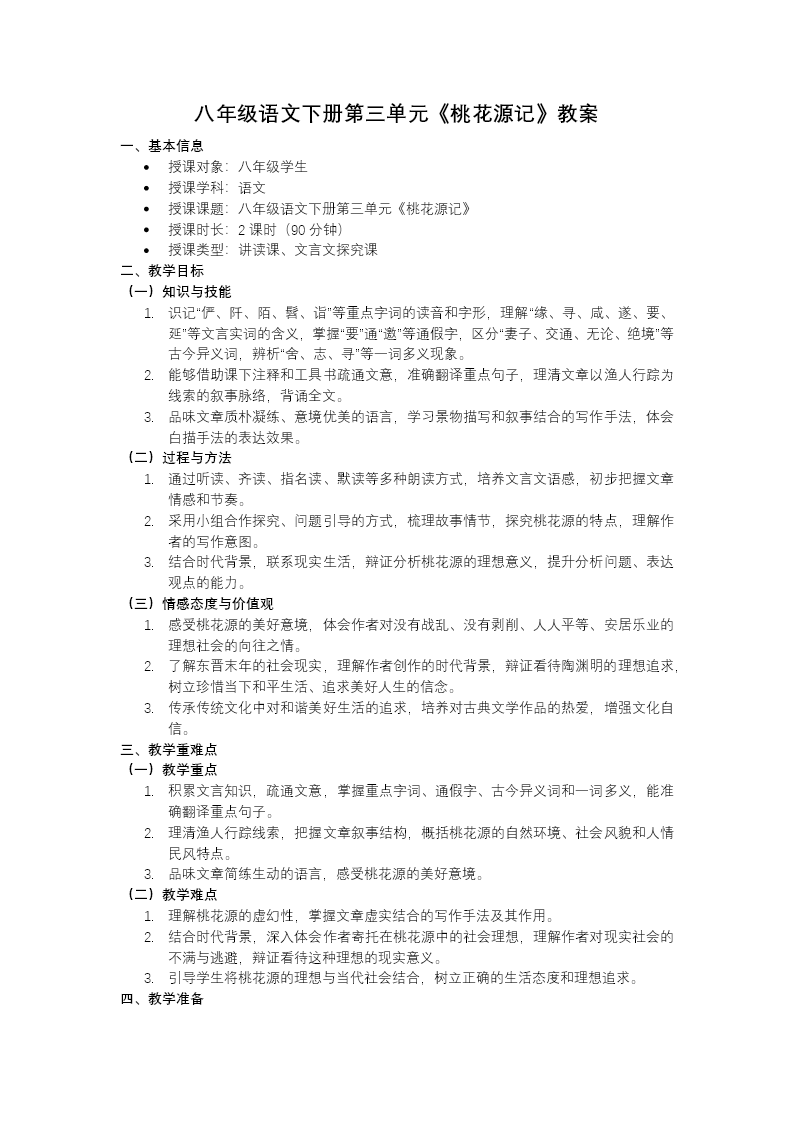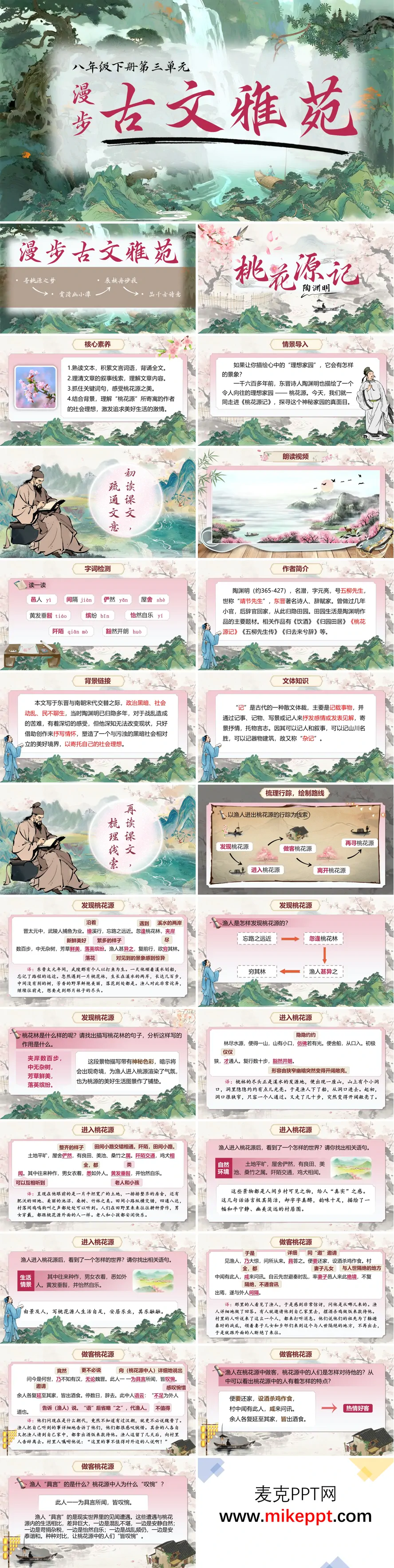 这是八年级下册《桃花源记》完整教学课件,共48页,主题为"漫步古文雅苑",以国风山水为视觉风格,分两课时系统授课。 开篇明确核心素养目标,通过情境导入、作者与文体介绍、字音字词检测,夯实文言基础,同时补充东晋乱世的写作背景,帮助学生理解创作动机。第一课时以渔人行踪为线索,逐段拆解"发现-进入-做客-离开-再寻"桃花源的完整叙事,梳理情节脉络,分析景物描写、人物形象与关键语句的作用,配套朗读与复述训练,落实文意疏通。 第二课时聚焦深度赏析,从自然美、人文美切入,探讨桃花源的虚实属性、结尾刘子骥寻访的作用,深挖陶渊明对理想社会的寄托与对现实的批判,梳理文章线索与主旨。最后配套课后练习、成语积累与作业布置,涵盖文言字词、古今异义、背诵与创意写作,全方位落实文言教学目标,帮助学生理解文本、品味意境、感悟作者情怀。