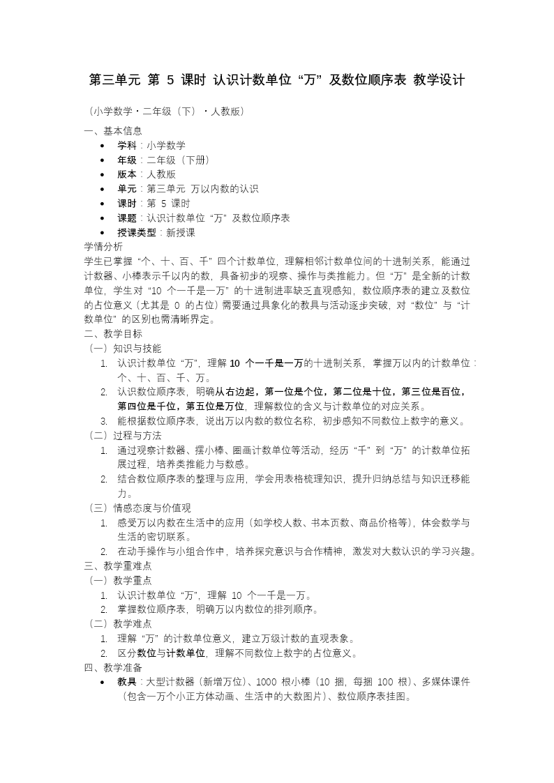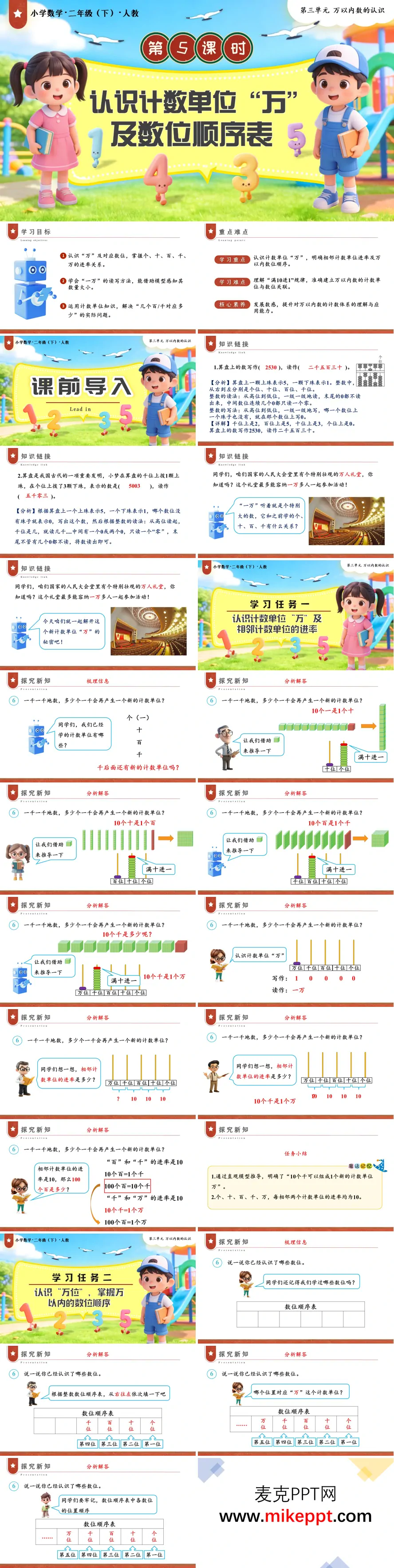 这是一套人教版小学数学二年级下册第三单元《万以内数的认识》第5课时的教学课件,主题为《认识计数单位"万"及数位顺序表》。 课件开篇明确学习目标、重难点及核心素养要求,以算盘读数和万人礼堂场景导入新课,激发学生对大数的认知兴趣。 教学分两大任务展开:任务一通过立方体模型直观演示,引导学生理解"10个千是一万",建立"万"的计数单位概念,明确个、十、百、千、万相邻单位间的十进关系;任务二讲解万位的位置及意义,帮助学生构建完整的万以内数位顺序表,理清从右往左的数位排列规律。 课件配套设计了课堂达标练习,包括满十进一、数位填空、进率判断等题型,巩固学生对计数规律和数位顺序的理解。课程结尾以思维导图梳理知识脉络,并布置分层作业,满足不同层次学生的学习需求,整体设计紧扣课标要求,层次清晰,适合课堂教学使用。