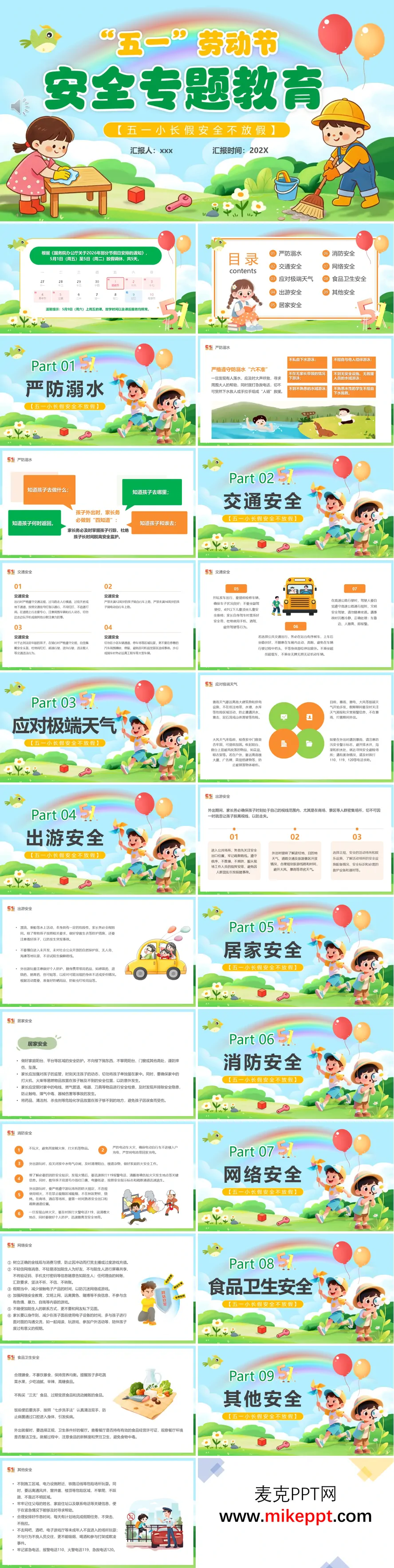 这套PPT是一份关于“五一小长假”期间儿童与青少年安全教育的演示文稿,内容全面且结构清晰。PPT的核心主题是“安全不放假”,旨在提醒家长和孩子们在假期中重视并防范各类潜在风险。 文档首先明确了2026年“五一”假期的具体日期(5月1日至5日)。随后,它以目录形式列出了九个主要的安全板块,涵盖了日常生活中的多个重点防范领域。其内容组织逻辑性强,从户外到室内,从物理安全到网络安全,逐一展开。 具体内容包括: 1.严防溺水:强调遵守“六不准”原则,并提醒家长做到对孩子行踪的“四知道”。 2.交通安全:详细规定了步行、骑行、乘坐私家车及公共交通时的安全准则,特别强调了年龄限制和远离车辆盲区。 3.应对极端天气:指导如何在暴雨、雷电、大风等天气中做好防护和避险。 4.出游安全:重点提醒家长在人群密集场所看护好孩子,提前规划行程,并注意活动场所与设施的选择。 5.居家安全:涉及阳台防护、危险物品(如刀具、药品、化学品)管理、防止单独留家等方面。 6.消防安全:(虽然此部分在提供的文本中未展开细节,但标题已点明主题) 7.网络安全:教育孩子树立正确消费观、防范网络诈骗、防止沉迷网络、文明上网,并建议家长多进行线下陪伴。 8.食品卫生安全:强调饮食均衡、食品选购、个人卫生及外出就餐的注意事项。 9.其他安全:补充了远离危险场所、牢记个人信息、规律作息、不进入不宜场所以及牢记紧急电话等要点。 整体而言,这份PPT通过分门别类、要点突出的方式,系统性地汇编了假期安全注意事项,图文并茂,具有很强的实用性和教育意义,是面向家庭的一份详尽假期安全指南。