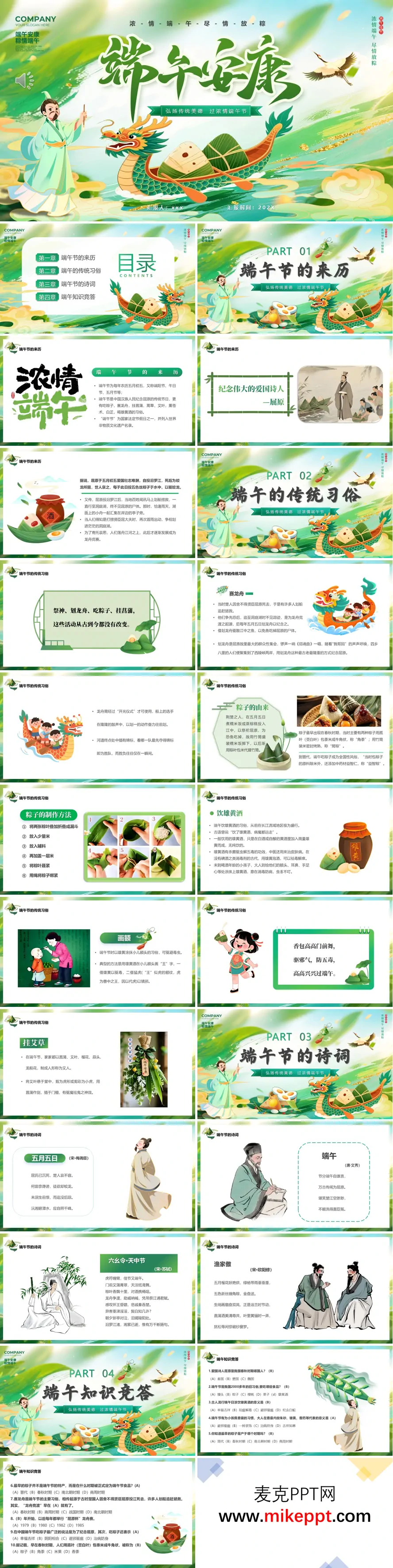 这套PPT以端午节为主题,从端午节的来历、传统习俗、相关诗词和知识竞答四个方面,系统地介绍了这一中国传统节日。 PPT的视觉设计紧扣节日氛围。整体色调以绿色、橙色、黄色等暖色系为主,营造出温馨、热烈的节日感。首页和尾页的设计相互呼应,均使用了“浓情端午 尽情放粽”的标语,并配有粽子、龙舟、艾叶、祥云等传统元素的插画。PPT的每一章都以一幅满版的、具有中国风特色的背景图作为分隔页,例如在介绍“端午节的来历”时,背景是龙舟、江水和水墨风格的山峦,而在“端午节的诗词”章节,则采用了古朴的卷轴和笔砚作为背景,与文化主题十分契合。正文页面的图片多与内容紧密相关,例如“端午节的来历”部分使用了屈原的画像和汨罗江的场景图;“传统习俗”部分的配图最为丰富,包括赛龙舟的热闹场面、粽子制作步骤的分解示意图、雄黄酒与画额的卡通图示,以及菖蒲、艾草、香囊等实物的特写图片,这些图片直观、生动地展示了端午习俗的方方面面;“诗词”部分则辅以水墨风格的配图,烘托出古典文学意境;“知识竞答”部分则采用简洁的问答形式,增强了互动性。整体图文搭配得当,视觉效果统一,既体现了端午节的传统文化内涵,又使演示文稿显得生动、美观。