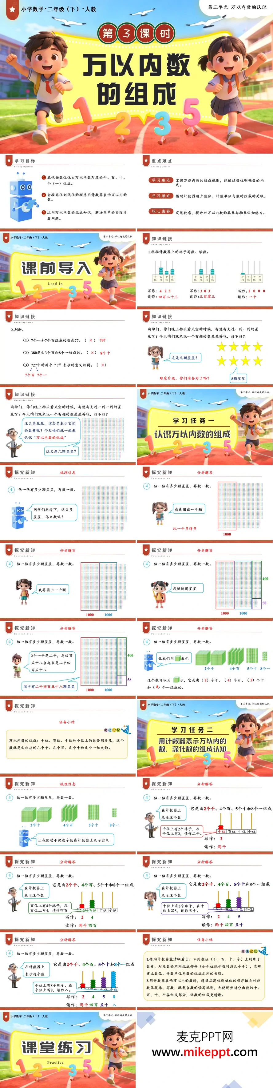 这是一套人教版小学数学二年级下册第三单元《万以内数的认识》第3课时的教学课件,主题为《万以内数的组成》。 课件开篇明确学习目标、重难点及核心素养要求,以计数器读数和数的组成判断题导入新课,激活学生已有认知。 教学分两大任务展开:任务一以"数星星"情境为例,引导学生理解万以内数是由千位、百位、十位、个位上相应数量的计数单位组合而成,建立数的组成概念;任务二借助计数器演示,讲解从高位到低位逐位拨珠表示数的方法,帮助学生建立数位、计数单位与数的组成之间的内在联系。 课件配套设计了课堂达标练习,涵盖数的组成分析和计数器表示数等题型,巩固学生对数概念的理解。课程结尾以思维导图梳理知识框架,并布置分层作业,满足不同层次学生的学习需求,整体设计注重直观操作与抽象思维的结合,符合课程标准要求,适合课堂教学使用。
