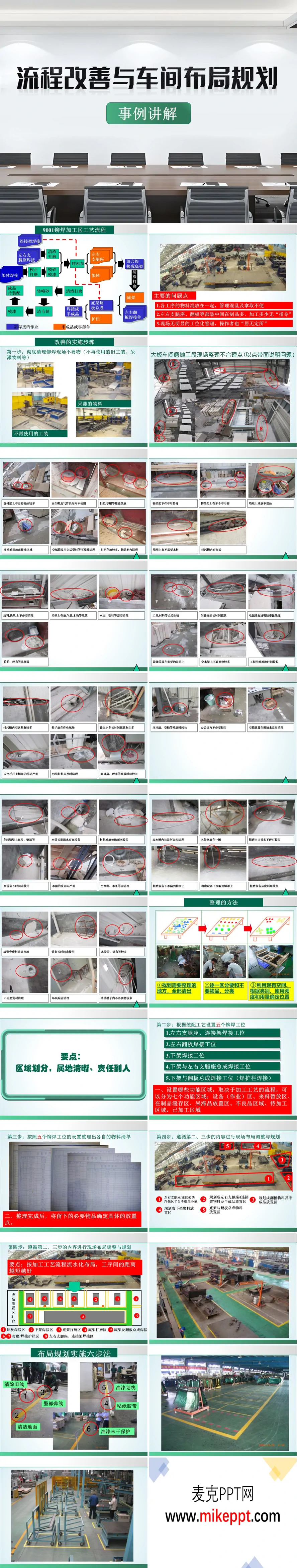 这套PPT主要介绍了制造车间(特别是铆焊车间)流程改善与布局规划的案例。内容分为问题点识别、改善步骤和实施方法三个主要部分。 首先,PPT通过多张现场照片指出了车间存在的主要问题,包括: 1.整理混乱:各工序物料混放,管理混乱,拿取不便。 2.在制品管控缺失:如左右支腿座、翻板等部件在加工过程中缺少明确的生产“指令”,导致中间在制品积压。 3.工位化管理缺失:现场没有明显的工位划分,操作者位置不固定。 4.现场存在大量“不要物”:PPT展示了大量现场照片,具体指出了诸多不合理点,例如:资材架上摆放过多不需要的物品;注油桶、安全帽、气管、空纸箱、废料、工具、闲置物品等随意放置在作业区、通道或墙壁上;清扫工具如扫把存放过多且杂乱;办公桌、物品架下堆满不必要品;设备旁、排污槽内有空饮料瓶、废弃包装材料;甚至存在电源线用透明胶带做绝缘、安全栏杆螺丝松动等安全隐患。 针对这些问题,PPT提出了系统性的改善实施步骤: 第一步是“整理”:彻底清理现场不要物,如不再使用的旧工装和呆滞物料。其具体方法是:找到需要整理的区域,将全部物品清出;逐一区分必要与不必要的物品并分类;然后根据物品类别、使用频率和用量,利用现有空间确定其合理存放位置。要点是“成区划分,属地清晰、责任到人”。 第二步是“整顿”与布局规划:根据装配工艺,在铆焊区域设置了五个明确的焊接工位(如左右支腿座焊接、翻板焊接、下架焊接等),并依据工艺流程图,规划出设备区、来料区、在制品缓存区等七个功能区域。PPT随后展示了如何为“左支腿座”工位整理出详细的物料清单(BOM表),列出了从“左背板”到“加强筋”等十几种零部件的代号、名称和数量。 第三步是布局实施与“三定”原则:PPT介绍了布局规划实施的“六步法”,从清除旧线到弹线规划。特别强调了物料及半成品的放置应寻求最佳盛具(如型材用悬臂架、小件用货架和小推车),并遵循“整顿”的“三定原则”——定点(放在哪里合适)、定容(用什么容器、颜色)、定量(放置合适数量),以达成省时、拿取方便的目标。同时,对焊线管理提出了明确要求,即不可拖拉在绿色通道中。 最后,PPT列出了后续工作安排,要求各车间根据工艺流重组功能区、彻底清理不要物并划分责任区,无法自行整改的需提交方案统一检讨。