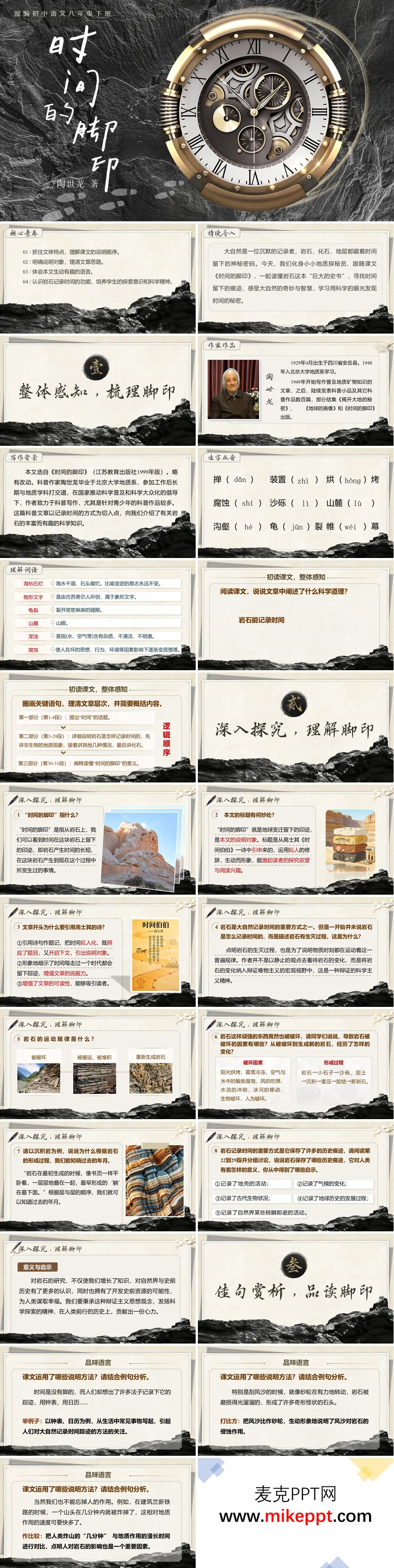 这是部编初中语文八年级下册《时间的脚印》教学课件,共32页,围绕课文展开系统教学。 开篇明确核心素养目标:抓住文体特点、理清说明顺序,明确说明对象,体会生动语言,认识岩石记录时间的功能,培养探索意识。以情境导入,引出"岩石记录时间"的核心主题。 主体分三模块推进:一是整体感知,梳理文章逻辑顺序,将课文分为"提出时间话题、详解岩石记时原理、阐释读懂时间脚印的意义"三部分,明确核心科学道理;二是深入探究,解读"时间的脚印"内涵,分析标题妙处、开篇引用诗句的作用,讲解岩石的运动规律、破坏因素与形成过程,梳理岩石记录的地壳活动、气候变迁、古生物等历史痕迹,点明研究意义;三是佳句赏析,结合例句分析举例子、打比方、作比较、列数字等说明方法,赏析拟人、排比等修辞,品味课文生动严谨的语言。