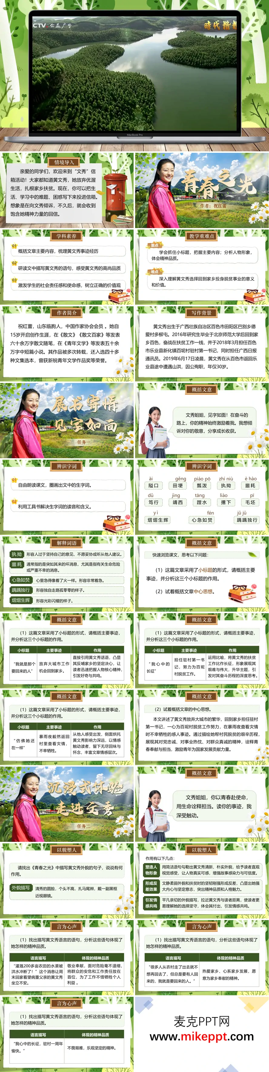 这是以时代楷模黄文秀事迹为主题的初中语文教学课件,共37页,围绕祝红蕾纪实作品《青春之光》展开。 开篇以"文秀信箱"情境导入,明确学科素养目标:梳理黄文秀事迹、感悟其高尚品质、培养社会责任感;明确教学重难点,重点为把握小标题结构、分析人物形象,难点为理解黄文秀返乡扶贫的价值与意义。先介绍作者祝红蕾与写作背景,梳理黄文秀北师大毕业返乡、驻村扶贫、因公殉职的生平,夯实字词基础;再分三大任务推进教学。 任务一"展书寄情,见字如面":梳理文章三个小标题的内容与作用,概括文章主旨,明确黄文秀放弃大城市、扎根家乡扶贫、奉献生命的核心事迹。任务二"沉浸式体验,走进文秀":从外貌、语言、村民评价等角度,分析黄文秀热爱家乡、一心为民、勇于担当、无私奉献的人物形象,解读其精神品质。任务三"微光成炬,精神接力":赏析"青春之光"标题的妙处,探讨黄文秀返乡的意义,结合现实谈启示,拓展学习其精神在现实中的应用。