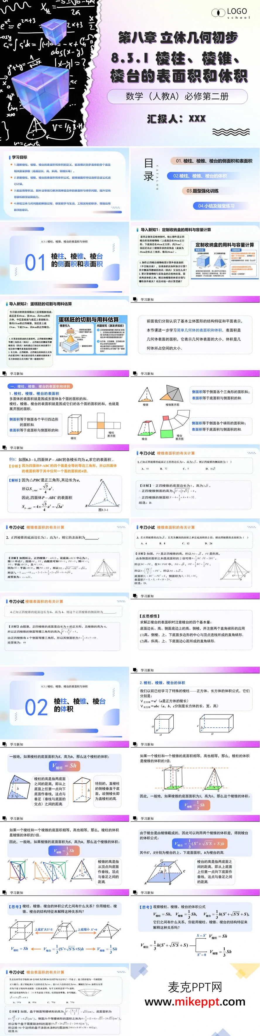 这是人教A高中数学必修第二册8.3.1《棱柱、棱锥、棱台的表面积和体积》教学课件,共55页,是立体几何章节开篇基础内容。 开篇明确学习目标:理解三类多面体的表面积、体积公式及推导逻辑,掌握公式直接计算,解决组合体、实际应用问题,提升空间想象与运算能力。 主体分四大模块:一是表面积部分,讲解棱柱、棱锥、棱台的侧面积与表面积公式,核心是"展开图法",即表面积等于各面面积之和,搭配正四面体、正四棱锥等典型例题,梳理正棱台计算的核心直角梯形模型;二是体积部分,讲解体积公式及推导逻辑;三是题型强化训练,分表面积与体积的直接计算、组合体的切拼挖补问题、等积法割补法的技巧应用三大题型,总结通用解题步骤与方法;四是小结与随堂练习,系统梳理三类多面体的公式体系,配套课后习题与作业,强化知识点掌握。