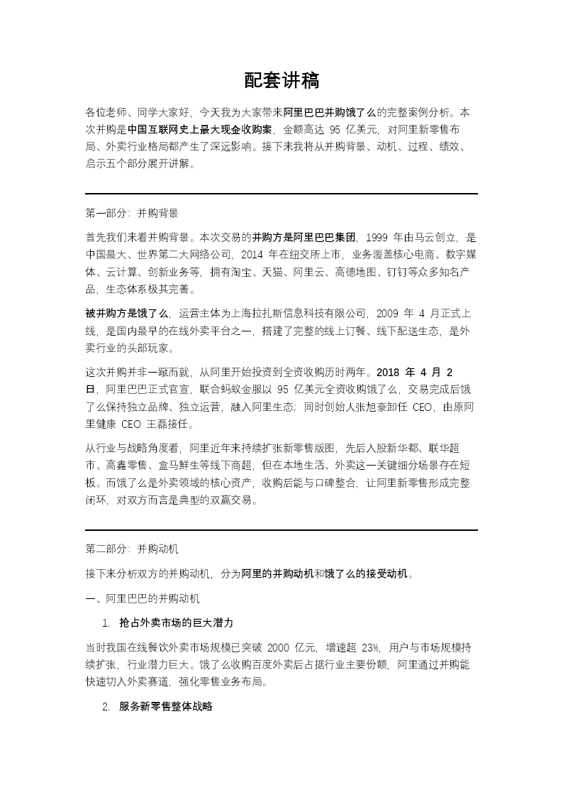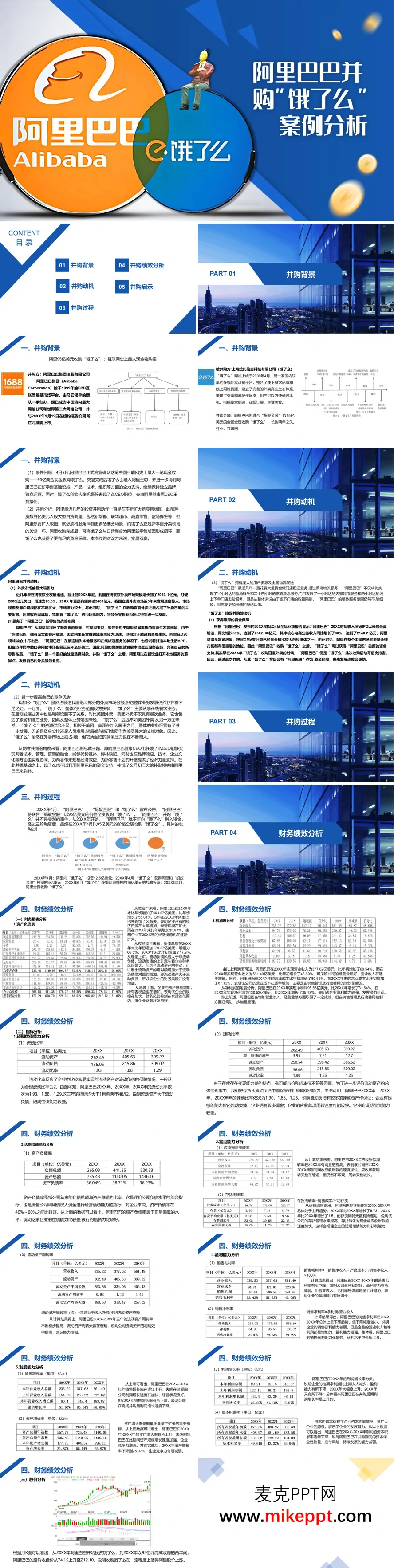 这套PPT的标题是《阿里巴巴并购“饿了么”案例分析》,核心内容围绕阿里巴巴在20XX年以95亿美元全资收购“饿了么”这一中国互联网史上最大的现金收购案展开。其内容结构清晰,主要分为五个部分。 首先,PPT介绍了并购背景。它指出阿里巴巴是中国最大的网络公司之一,而“饿了么”是国内领先的在线外卖平台。此次并购是阿里巴巴联合蚂蚁金服进行的全资收购,旨在将“饿了么”融入阿里生态,以支持其新零售战略。 其次,PPT详细分析了并购动机。从阿里巴巴的角度看,主要动机包括:看好快速增长的外卖市场、服务于其“新零售”的战略布局以弥补本地生活服务的短板,以及获取“饿了么”庞大的用户与物流配送网络。从“饿了么”的角度看,动机则是获得阿里雄厚的资金支持,并借助阿里的资源提升自身在激烈市场竞争中的优势,实现双方的优势互补。 第三,PPT概述了并购过程。这是一个分阶段投资直至最终收购的过程,从20XX年开始,阿里巴巴通过多轮融资,最终在20XX年4月以95亿美元完成全资收购。 第四,也是篇幅最长的部分,是对并购后的财务绩效分析。该部分通过资产负债表、利润表及一系列财务比率(如流动比率、速动比率、资产负债率、各种周转率及盈利能力、发展能力指标),分析了阿里巴巴在并购前后(20XX-20XX年)的财务状况。分析指出,公司资产与经营规模扩大,营业收入和净利润持续增长,短期与长期偿债能力较强,营运能力有所提升,但销售毛利率和净利率有所下降,并购后的资产增长率和资本积累率也出现放缓。同时,PPT通过股价月K线图指出,在并购期间阿里巴巴股价呈现上涨趋势。 最后,PPT总结了从此案例中得出的并购启示。强调企业并购应服务于总体战略,提前做好财务规划与风险防范,关注并购对价、融资结构的合理性,并在并购后重视资源与文化整合,以实现协同效应。 综上所述,这套PPT系统性地剖析了阿里巴巴并购“饿了么”的背景、动因、过程、财务影响,并提炼了相关的战略与财务启示。