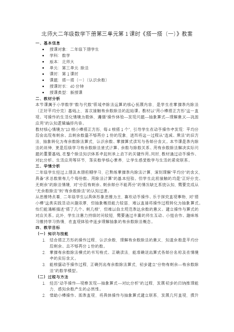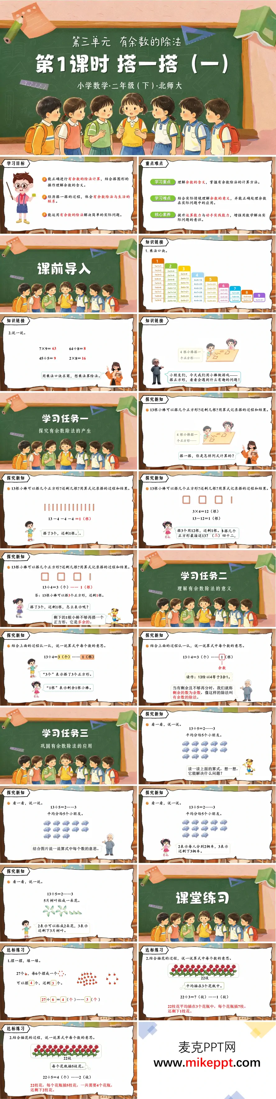 这是北师大小学数学二年级下册《有余数的除法》单元第1课时《搭一搭(一)》教学课件,共28页,风格童趣活泼,贴合低龄学生特点。 内容以"搭正方形"为情境导入,先复习乘法口诀与表内除法,再通过"13根小棒搭正方形"的实操探究,引出有余数除法的算式表示(如13÷4=3……1),讲解余数的含义、算式读法及各部分意义。接着结合分物品、贴树叶等实例,帮助学生理解余数在不同场景中的应用。 配套的课堂练习与达标题目,通过摆物品、插花等生活化场景巩固知识,最后总结核心概念并布置课后作业。整套课件以"操作+算式+实例"的方式,循序渐进地引导学生理解余数的意义,掌握有余数除法的计算与应用,兼顾知识讲解与动手实践,符合二年级学生的认知规律。