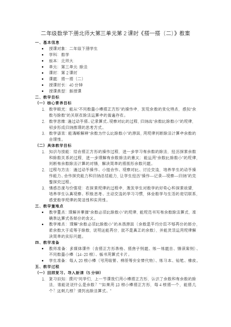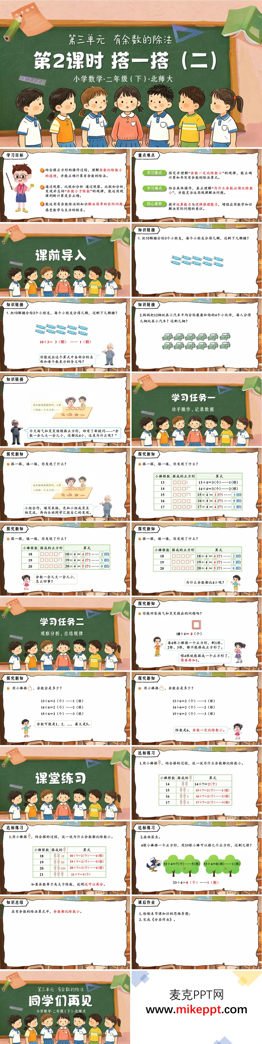 这是北师大二年级下册《有余数的除法》单元第2课时《搭一搭(二)》教学课件,共24页,承接上一课时,聚焦"余数比除数小"的核心规律。 课程先以分糖果、分玩具的情境复习有余数除法基础概念,再通过"用不同数量小棒搭正方形"的实操探究,让学生填写表格、观察算式,发现余数的变化规律。随后引导学生对比除数与余数的关系,理解"余数必须比除数小"的道理,并用搭六边形的例子拓展验证这一规律。 课堂练习部分,通过搭图形说理、"森林医生"改错等题型,帮助学生巩固对规律的理解与应用。最后总结核心结论并布置课后作业。整套课件延续童趣风格,以"操作—观察—总结—应用"的流程,循序渐进地突破教学重难点,培养学生的逻辑推理能力,贴合二年级学生的认知特点。