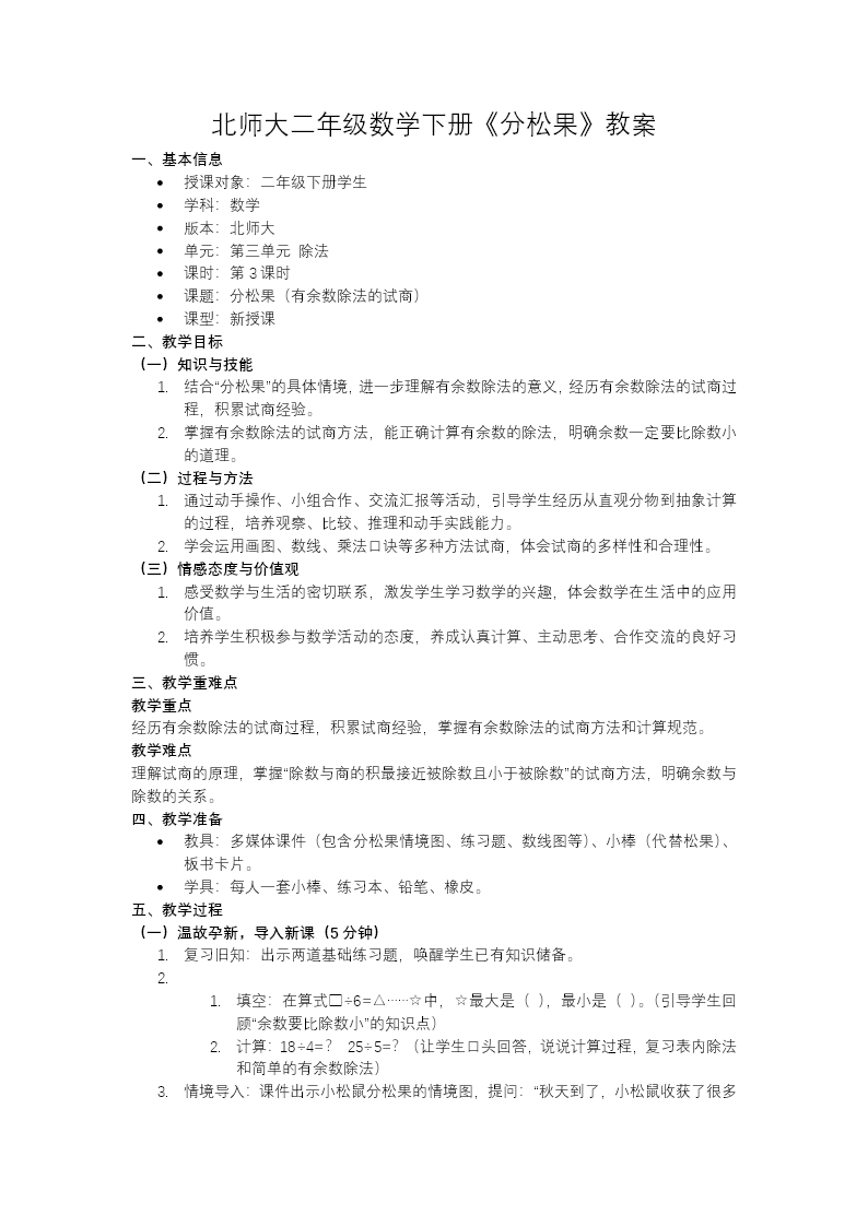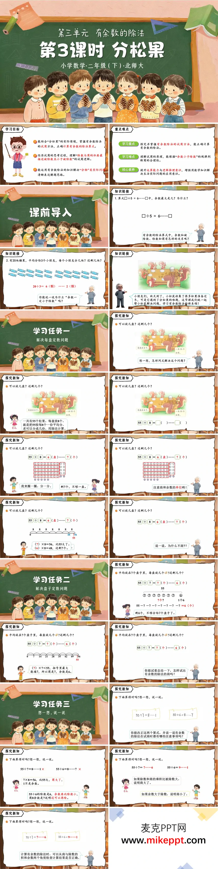 这是北师大二年级下册《有余数的除法》第3课时《分松果》教学课件,共32页,核心是教学生掌握有余数除法的试商方法。 课程以"分松果"的生活化情境切入,先复习余数与除数的关系,再通过"55个松果"的两个问题展开探究:已知每盘放8个,求能放几盘;已知有7个盘子,求每盘放几个。教学中通过圈一圈、数线图、乘法口诀试商等方式,引导学生理解"除数与商的积要最接近且小于被除数"的试商逻辑,并结合错题辨析,强调"余数小于除数"的验算要点。 课堂练习通过积木分配、括号填数、抱抱团游戏等题型,巩固试商方法的应用。整套课件以"问题探究+方法总结+纠错练习"的结构,帮助学生突破试商难点,同时培养逻辑推理能力,贴合低段学生的认知特点。