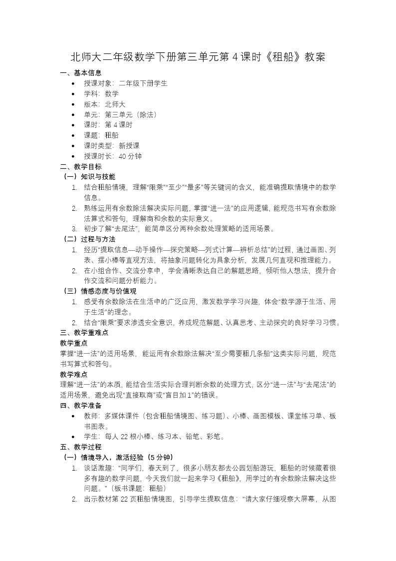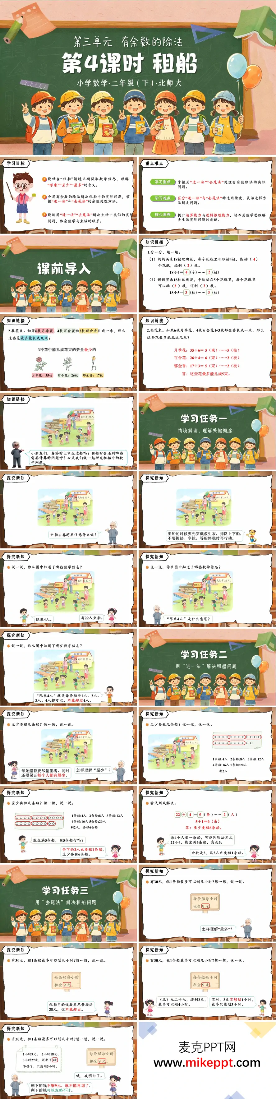 这是北师大二年级下册《有余数的除法》单元第4课时《租船》教学课件,共35页,核心内容是运用有余数除法解决"进一法"和"去尾法"的实际问题。 课程以"租船"生活化情境导入,先复习表内除法及余数相关知识,随后通过"22人租船,每船限乘4人""30元租船,每小时8元"等探究任务,引导学生分析问题。解决"至少要租几条船"时,讲解"进一法",即余数不为0时商需加1;解决"最多划几小时"时,讲解"去尾法",即只取商的整数部分,忽略余数。 课堂练习通过租船、买东西等实例,进一步巩固两种方法的运用。整套课件以"情境分析—列式计算—方法总结—易错辨析"的逻辑展开,贴合低段学生认知,帮助学生掌握有余数除法在实际生活中的灵活应用。