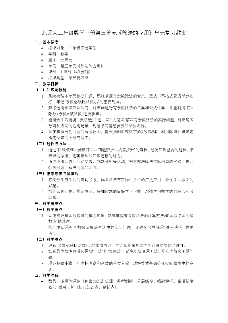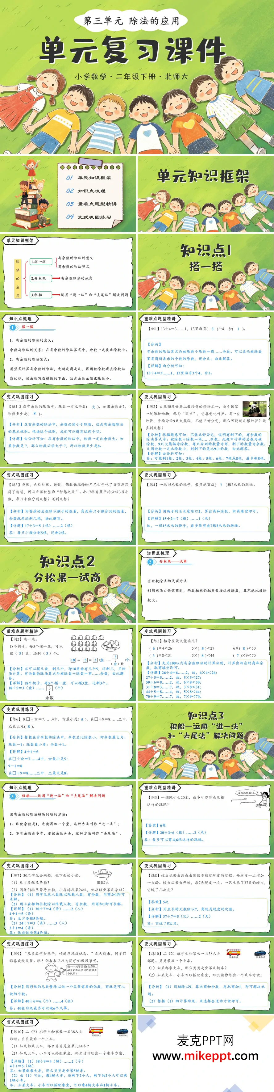 这是北师大二年级下册第三单元《除法的应用》单元复习课件,共28页,用于系统梳理有余数除法的核心知识。 课件先搭建单元知识框架,再分三大模块复习:一是"搭一搭",回顾有余数除法的意义与"余数一定小于除数"的核心规则,配套基础判断题与计算题巩固概念;二是"分松果—试商",讲解利用乘法口诀试商的方法,通过括号填数、余数与除数关系题强化试商技巧;三是"租船—解决问题",重点区分"进一法"(如租船、乘车)与"去尾法"(如裁绳、做衣服)的应用场景,通过变式练习让学生掌握实际问题的解法。 整套课件以"框架梳理—知识点精讲—典型例题—变式练习"的结构展开,题型丰富、讲解清晰,帮助学生查漏补缺,巩固有余数除法的计算与应用能力。