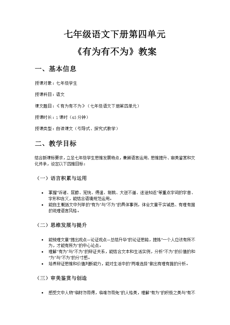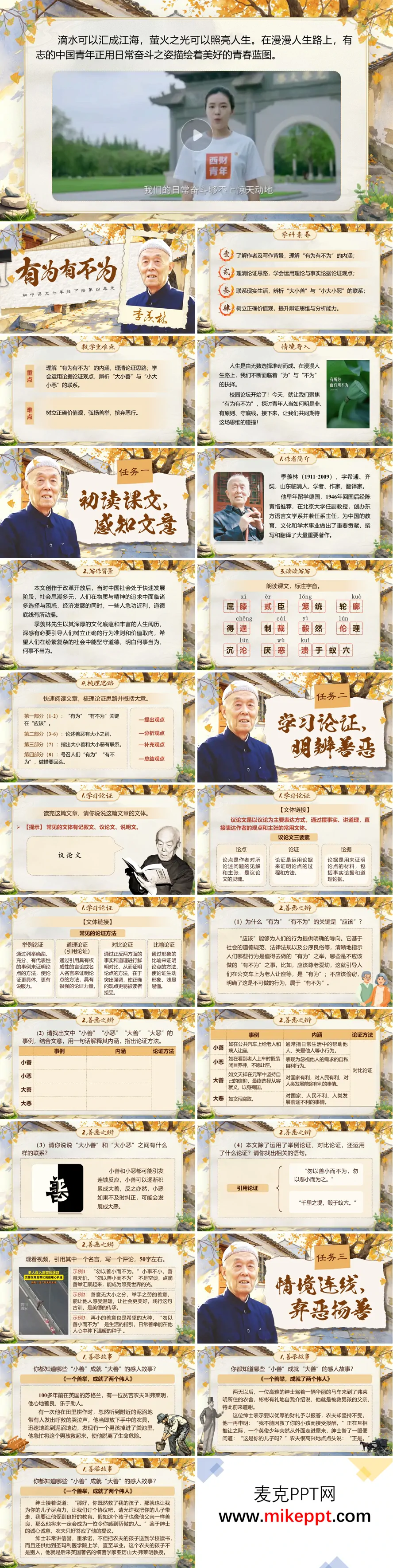 这是初中语文七年级下册《有为有不为》教学课件,共33页,围绕季羡林的议论文展开。 以"青春奋斗"主题导入,先介绍作者季羡林与写作背景,再通过"初读课文、感知文意"环节梳理文章结构,讲解议论文三要素与常见论证方法。接着聚焦"善与恶",辨析"小善、小恶、大善、大恶"的内涵,结合文本分析举例、对比、引用等论证方法,引导学生理解"勿以善小而不为,勿以恶小而为之"的道理。 后续通过"善举故事""新闻评论""情境演绎"等活动,引导学生联系生活实际,辨析是非对错,树立正确价值观。结尾布置主题演讲与批注作业,帮助学生巩固议论文知识,提升辩证思维与价值判断能力。整体设计由文本解读到生活实践,层层递进,兼具知识性与思想性。