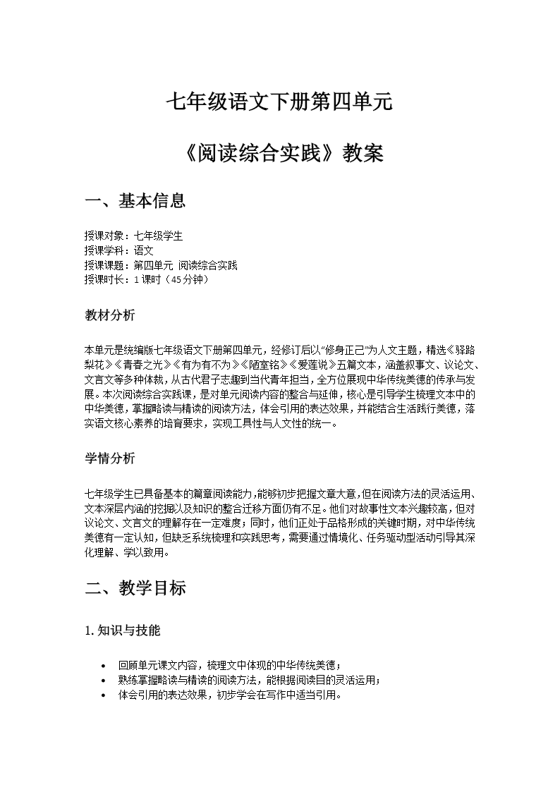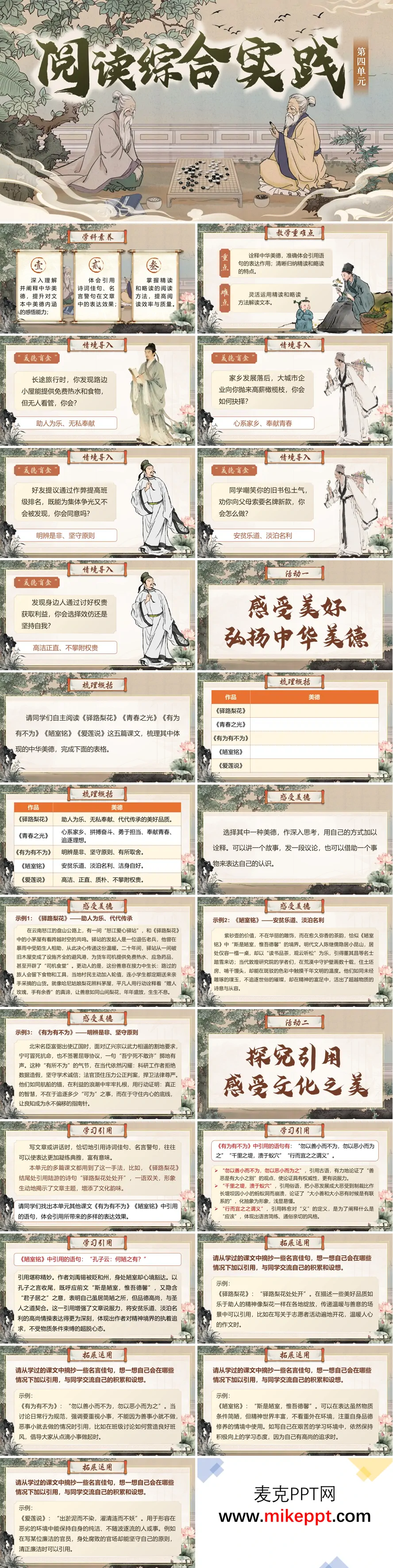 这是初中语文第四单元《阅读综合实践》教学课件,共36页,围绕单元主题设计三大学习活动。 以"美德盲盒"情境导入,引导学生联系生活辨析是非。活动一梳理单元课文(如《驿路梨花》《陋室铭》等)所蕴含的中华美德,如助人为乐、安贫乐道、高洁正直等,帮助学生理解并诠释美德内涵。活动二聚焦"引用"手法,结合课文中的名句讲解引用在文中的表达效果,并引导学生学习在写作中恰当引用名言警句。活动三讲解精读与略读的阅读方法,对比两种方法的目的、适用对象与主要技巧,并以《爱莲说》为例,示范如何结合略读快速把握大意、精读深入品味文本,提升阅读效率与质量。 结尾布置"美德主题手抄报"与"语句赏析"作业,整体将美德理解、语文知识学习与阅读方法实践相结合,兼具思想性与实用性。