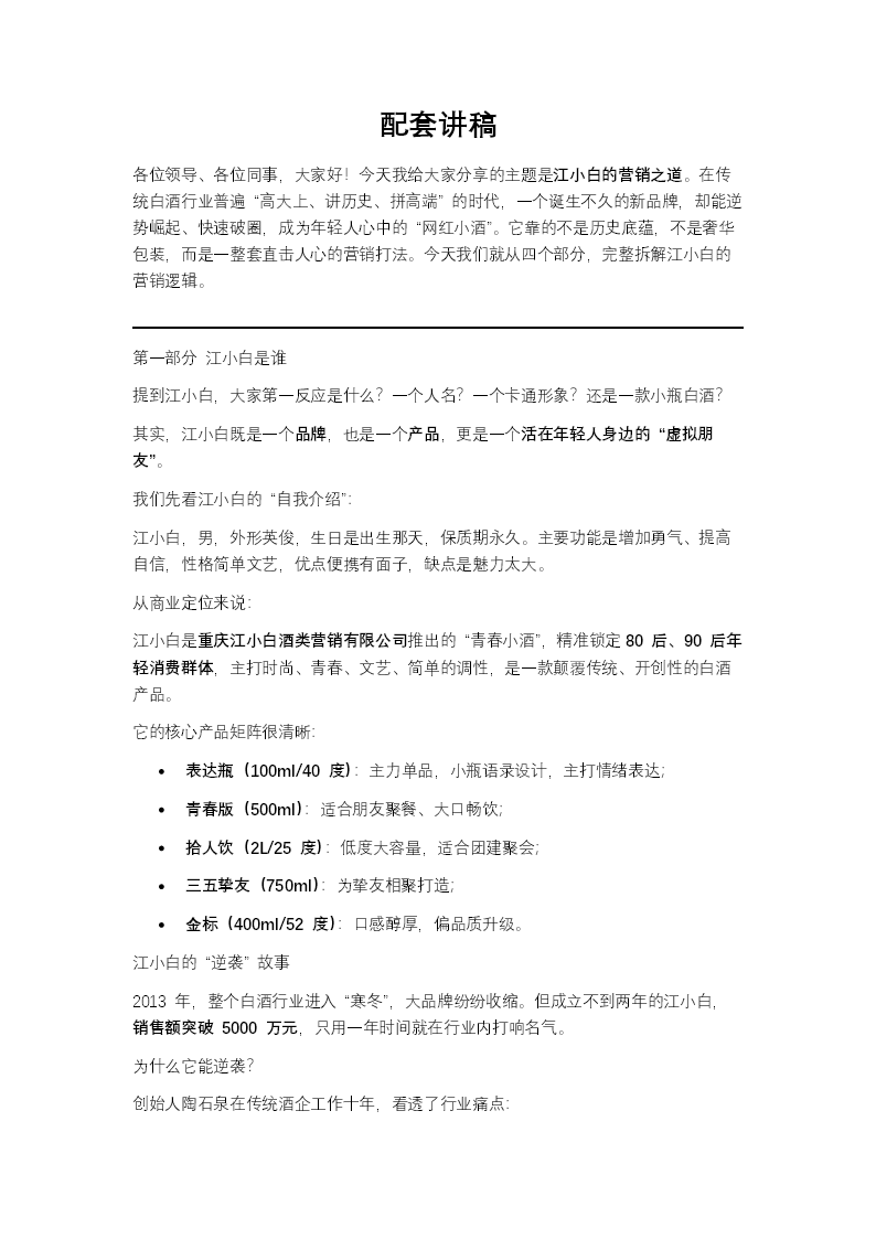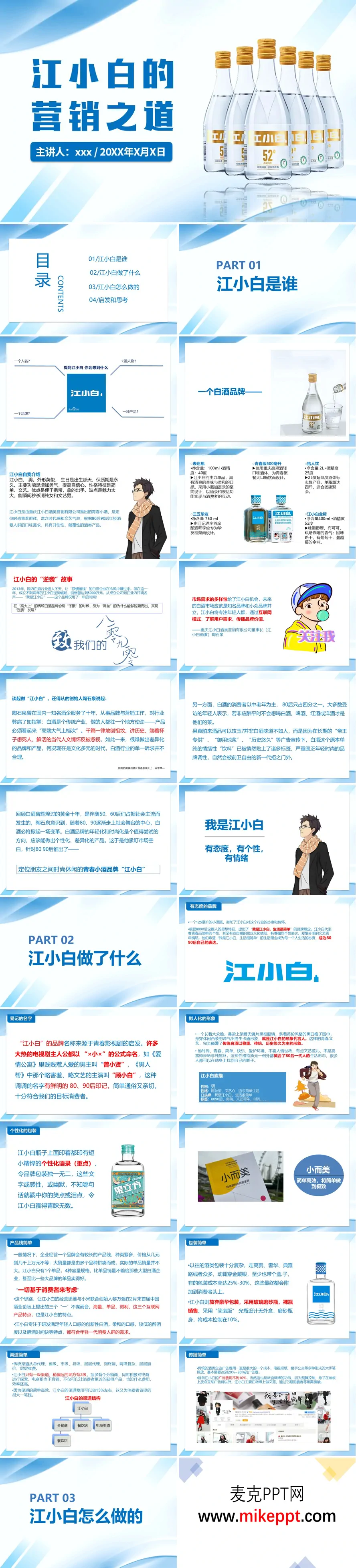 这套PPT阐述了白酒品牌“江小白”的品牌定位、产品策略、营销创新与商业启示。整体视觉风格简约、文艺且年轻化,与品牌“生活很简单”的核心理念高度一致。 PPT以“江小白是谁”开篇,通过一个系着黑白格子围巾、戴着无镜片黑框眼镜的卡通男生形象,确立了品牌拟人化的“青春文艺”代言人,与传统白酒厚重、历史的形象形成鲜明对比。图片展示了其核心产品线,如100ml的“表达瓶”(瓶身印有走心语录)、2L的“拾人饮”及52度的“金标”等,突出了其针对年轻人群设计的不同容量、酒精度和饮用场景。 核心内容“江小白怎么做的”部分,图片生动呈现了其以社交媒体为核心的O2O营销模式。例如,展示了充满幽默感和社会洞察的“江小白体”语录瓶特写、微博微信的互动截图(如“简单生活”话题)、以及线上文案与线下活动的联动图片。线下活动图片尤为丰富,包括成都地铁的温情互动广告、重庆餐厅“小心地滑扯着蛋”的趣味提示牌,以及“末日醉后真言派对”、“同城约酒大会”等大型粉丝聚会的现场盛况照片,直观体现了品牌通过制造话题和激发用户参与来构建流行。 最后,PPT总结了其“简单专注、用户至上、社会化传播”的互联网思维打法,所有配图都紧密围绕“与年轻人共鸣”这一主题,通过大量生活化、场景化的真实图片,而非单纯的产品陈列,完整勾勒出江小白如何通过一个鲜明的品牌形象、一系列精准的产品和一套创新的营销组合,在传统白酒行业中成功开辟出一个青春细分市场。