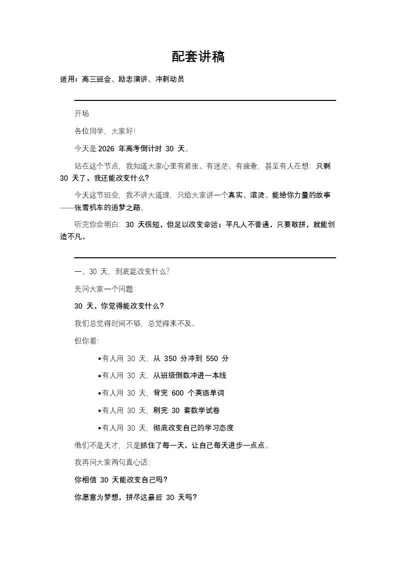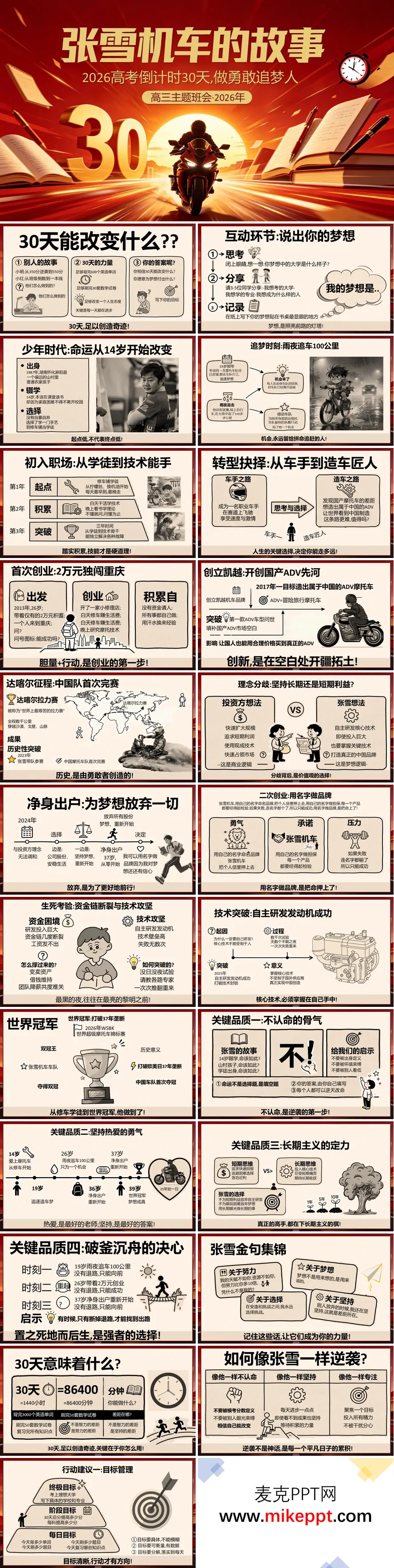 这套PPT以“张雪机车的故事”为引,结合高考30天倒计时的班会主题,通过张雪的奋斗经历,激励高三学子勇敢追梦,在冲刺阶段创造奇迹。 开场部分首先展现了“高考倒计时30天,做勇敢追梦人”的主题,并通过提问、数据(如600个单词、30套试卷)和互动环节(写下梦想),激发学生思考30天的潜力与个人目标,图片元素多为励志的标语和问号,营造了紧迫与希望并存的氛围。 主体部分的核心是张雪的成长故事。PPT通过一系列时间线式的图片和关键场景插图,串联起他的人生轨迹:从14岁因贫辍学成为修车学徒的起点,到雨夜骑车100公里追逐机会的执着画面;从怀揣2万元、白天修车晚上钻研技术的首次创业,到创立“凯越”、自主研发发动机直至带领车队在2023年达喀尔拉力赛首次完赛的突破;再到后来为坚持长期主义而净身出户、二次创立“张雪机车”品牌,并在2026年WSBK世界超级摩托车锦标赛打破垄断夺得双冠的高光时刻。这些故事配有修车铺、雨夜、赛道、冠军奖杯等具象图片,生动刻画了一个“不认命、坚持热爱、长期主义、破釜沉舟”的逆袭者形象。 后续部分从张雪的故事提炼出适用于学习的核心品质与行动方法。通过对比表格、时间规划表等形式,结合齿轮、灯塔、棋盘等比喻性图片,引导学生制定目标、管理时间、调整心态,并最终提供了具体的“30天行动计划表”,鼓励学生将梦想化为每日行动。 整体而言,这套PPT图文并茂,用张雪从山村学徒到世界冠军的传奇历程作为核心案例,其图片内容有效辅助了叙事,从具象的个人奋斗场景到抽象的励志符号,最终都服务于激励高三学子在最后30天坚定信念、踏实努力、实现梦想的核心主旨。