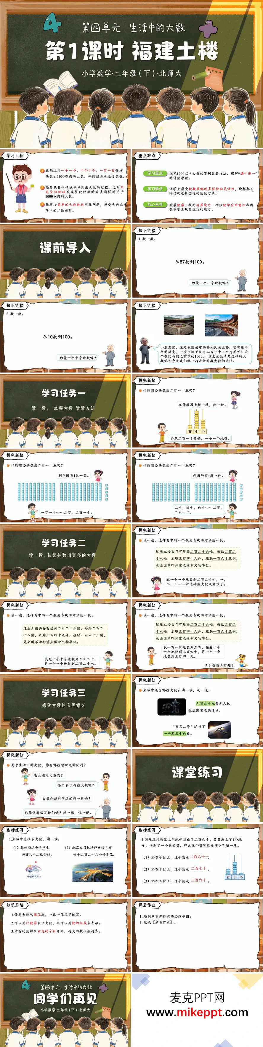 这是北师大小学数学二年级下册《生活中的大数》第四单元第1课时《福建土楼》教学课件,共24页。 课件围绕1000以内大数的认识展开,先通过学习目标明确教学方向,再以"从87数到100""从10数到100"的旧知练习导入,结合福建土楼的实际数据引出大数计数问题。接着通过三个学习任务展开新知:用计数器、数小棒等方式,教授一个一个、十个十个、一百一百地数大数的方法;借助土楼相关数据,练习用合适的方法数出更大的数;结合无人机、"天宫二号"等生活实例,感受大数的实际意义。 课堂练习环节设计读数、计数器拨数的题目巩固知识,最后总结读写大数的方法,并布置思维导图和分层作业。整体以情境化、多样化的计数活动,帮助学生理解"满十进一"的计数原理,培养数感。