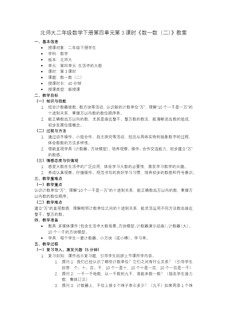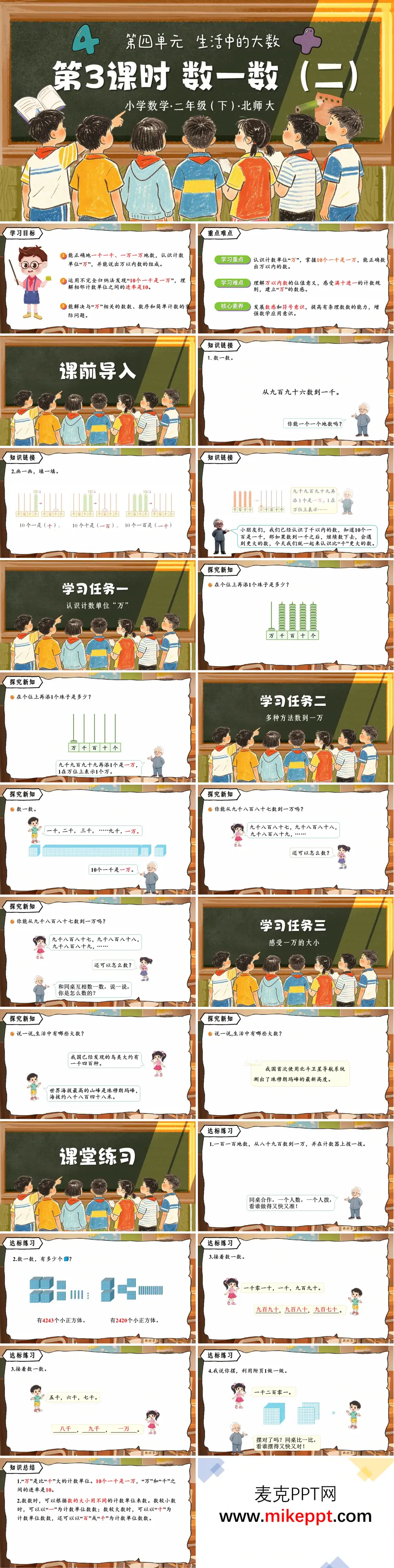 这是北师大二年级下册数学《生活中的大数》第四单元第3课时《数一数(二)》教学课件,共26页。 课件以学习目标开篇,明确认识计数单位"万"、理解"10个一千是一万"、掌握万以内数的数法等目标。课前通过旧知"从九百九十六数到一千"导入,复习计数规律,引出比千更大的数。 新知环节分为三个任务:借助计数器演示"9999添1是一万",认识计数单位"万";学习一千一千、一百一百等多种方法数到一万;结合鸟类数量、珠穆朗玛峰高度等生活实例,感受一万的实际意义。 课堂练习设计拨数、数方块、接着数等题目巩固知识,结尾总结计数单位间的进率和计数方法,并布置思维导图和分层作业,帮助学生建立万以内数的数感,理解"满十进一"的计数规则。
