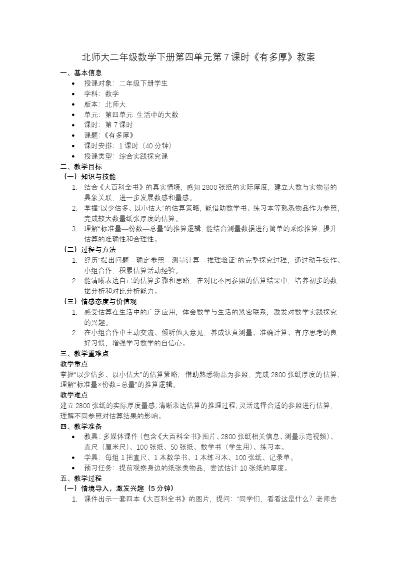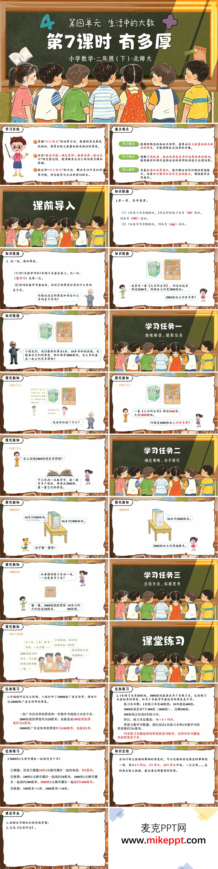 这是北师大二年级下册数学《生活中的大数》第四单元第7课时《有多厚》教学课件,共25页。 开篇明确学习目标:掌握"以小估大"的估算方法,借助熟悉物品推算大量纸张、物品的厚度。课前通过算一算、感知厚度的练习导入,引出"2800张纸大约有多厚"的探究问题。 新知环节分为三大任务:先解读情境、提取问题信息;再确定策略,引导学生以10本数学书(约500张纸)为参照,通过测量推算出2800张纸约厚28厘米;最后总结"从少量推算大量"的通用方法,拓展到练习本、硬币等不同物品的估算。 课堂练习设置宣传单、练习本、硬币等实际问题,强化估算思路。结尾总结"先找小标准、再推大数量"的方法,布置思维导图和分层作业,帮助学生体会估算在生活中的实用价值。