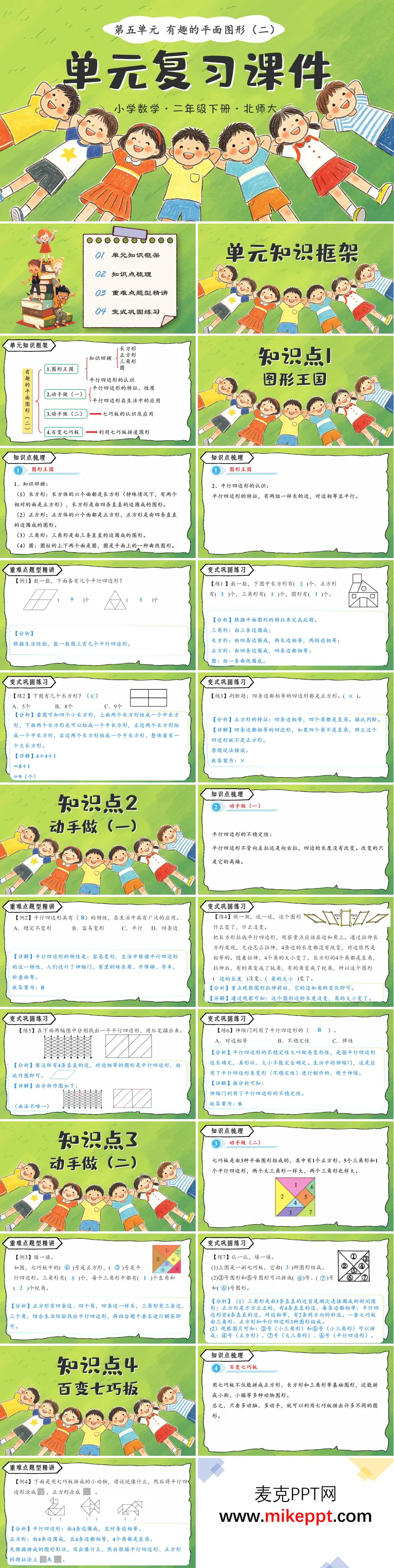 这是北师大二年级下册数学《有趣的平面图形(二)》第五单元复习课件,共28页,用于系统梳理单元知识。 课件以单元知识框架开篇,明确四大模块:图形王国、动手做(一)、动手做(二)、百变七巧板。 图形王国梳理长方形、正方形、三角形、圆和平行四边形的特征,配套数图形个数、判断题等练习,强化图形识别。动手做(一)讲解平行四边形易变形的特性,结合伸缩门等生活实例,帮助学生理解其在实际中的应用。动手做(二)介绍七巧板的组成,认识七巧板中不同图形的特点,掌握各板块的形状与数量。百变七巧板讲解用七巧板拼基础图形和动物图案的方法,配套涂色、找图形等练习,培养动手能力与空间想象力。