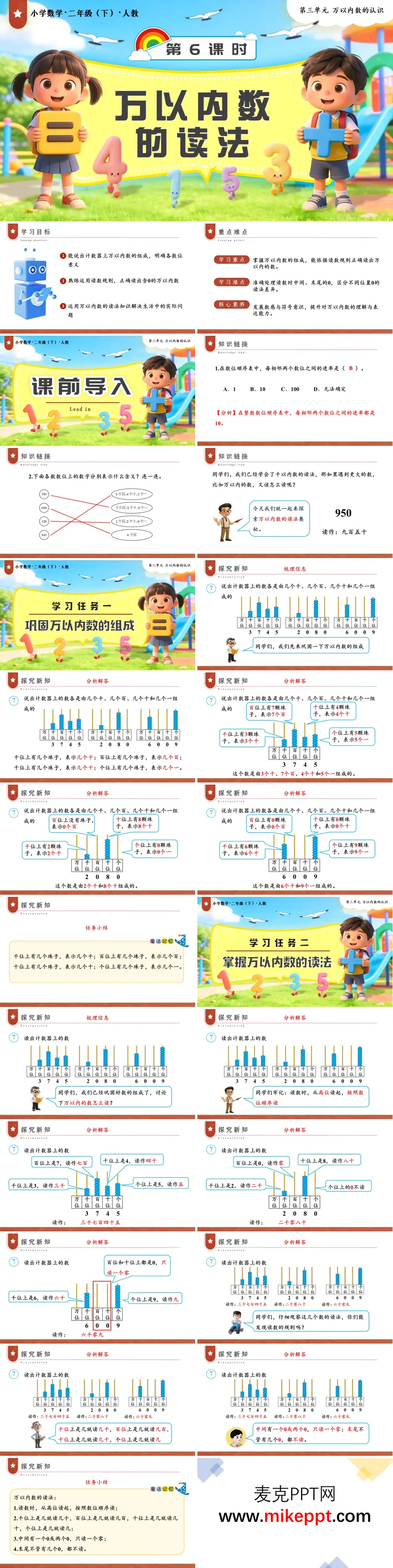 本课件为人教版二年级下册《万以内数的读法》教学设计,聚焦万以内数的认读规则。开篇明确学习目标与核心素养,课前通过数位进率复习和数的组成连线,激活学生已有认知。新课分两步展开:任务一借助计数器直观演示,巩固千位、百位、十位、个位上珠子的计数意义,强化数的组成理解;任务二通过典型例题,引导学生对比不同含0情况(中间有0、末尾有0)的读法,自主归纳"从高位读起、中间0只读一个、末尾0不读"的核心规则。巩固环节设置分层达标练习,涵盖数的组成填空与生活场景读数(如商品价格、门牌号)。课堂尾声以思维导图梳理读数要点,并布置差异化课后作业。全程依托计数器具象操作,将抽象读数规则可视化,帮助低年级学生在观察比较中掌握方法、发展数感。