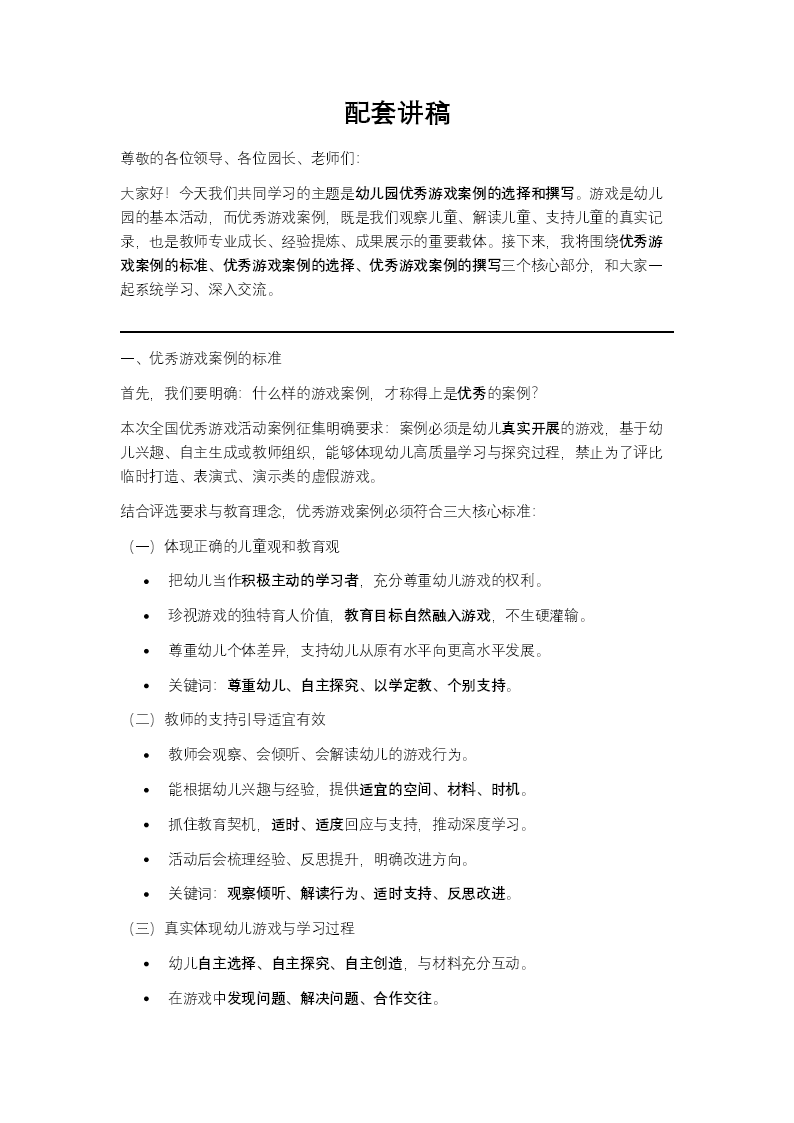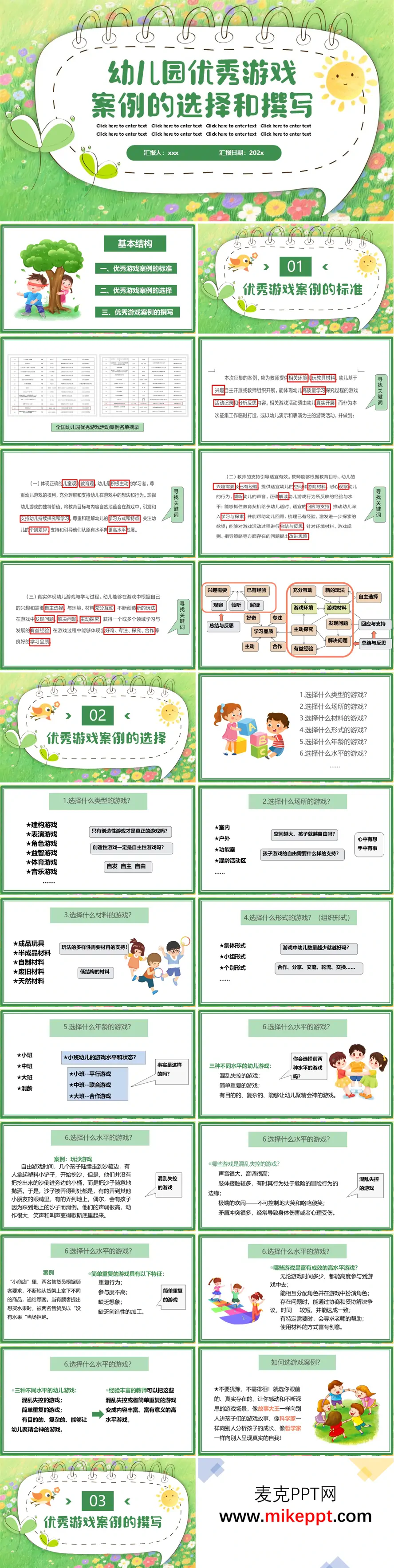 这套PPT的标题是“幼儿园优秀游戏案例的选择和撰写”,其核心内容是为幼儿教育工作者提供一套关于如何选择与撰写优秀游戏案例的指导框架。PPT的主体结构清晰,分为三大部分。第一部分是“优秀游戏案例的标准”。它明确指出了优秀案例应具备的核心特征:案例必须源于幼儿真实开展的游戏,而非为征集临时打造或表演;应体现正确的儿童观和教育观,尊重幼儿作为积极主动学习者的权利;游戏内容需具有适宜性和挑战性,能支持幼儿的持续探究;并且必须真实体现幼儿在游戏中的学习过程,展现出好奇、专注、探究、合作等良好的学习品质。文档中还以表格形式摘录了“全国幼儿园优秀游戏活动案例名单”,列举了如“一座‘危桥’的故事”、“引水欢乐多”、“油桶趣多多”等具体案例名称、对应班级、作者及选送单位,为读者提供了丰富的实例参考。第二部分深入探讨“优秀游戏案例的选择”。这一部分通过一系列关键问题引导思考者如何筛选有价值的游戏场景。它涵盖了游戏类型(如建构、角色、表演游戏等)、游戏场所(室内、户外)、使用材料(低结构材料更受推崇)、组织形式(个别、小组、集体)、幼儿年龄以及最重要的——游戏水平。PPT特别强调,应优先选择“有目的的、复杂的、能够让幼儿聚精会神的游戏”,并详细对比了“混乱失控的游戏”和“简单重复的游戏”与高水平游戏之间的区别,指导教师如何识别并转化低水平游戏。第三部分系统讲解了“优秀游戏案例的撰写”。它提出了一个标准的案例撰写结构,包括:一、活动背景(需具体说明玩教具材料、环境创设、儿童兴趣与前期经验、教师预期及游戏规则);二、活动内容与过程实录(强调要用“讲故事”的方式进行白描和深描,客观记录幼儿的关键行为与教师的支持回应);三、活动的特点及价值所在(要求分析游戏活动在幼儿学习与发展方面的价值,并反思教师支持的适切性与不足,提出进一步的策略)。文档通过“阳光隧道”、“纸牌建构”等具体示例,生动演示了每一部分应如何撰写。总而言之,这份PPT是一部实用性很强的操作指南,它从理念标准、筛选方法到文本撰写,为幼儿教师系统梳理了创作高质量游戏案例的全流程。