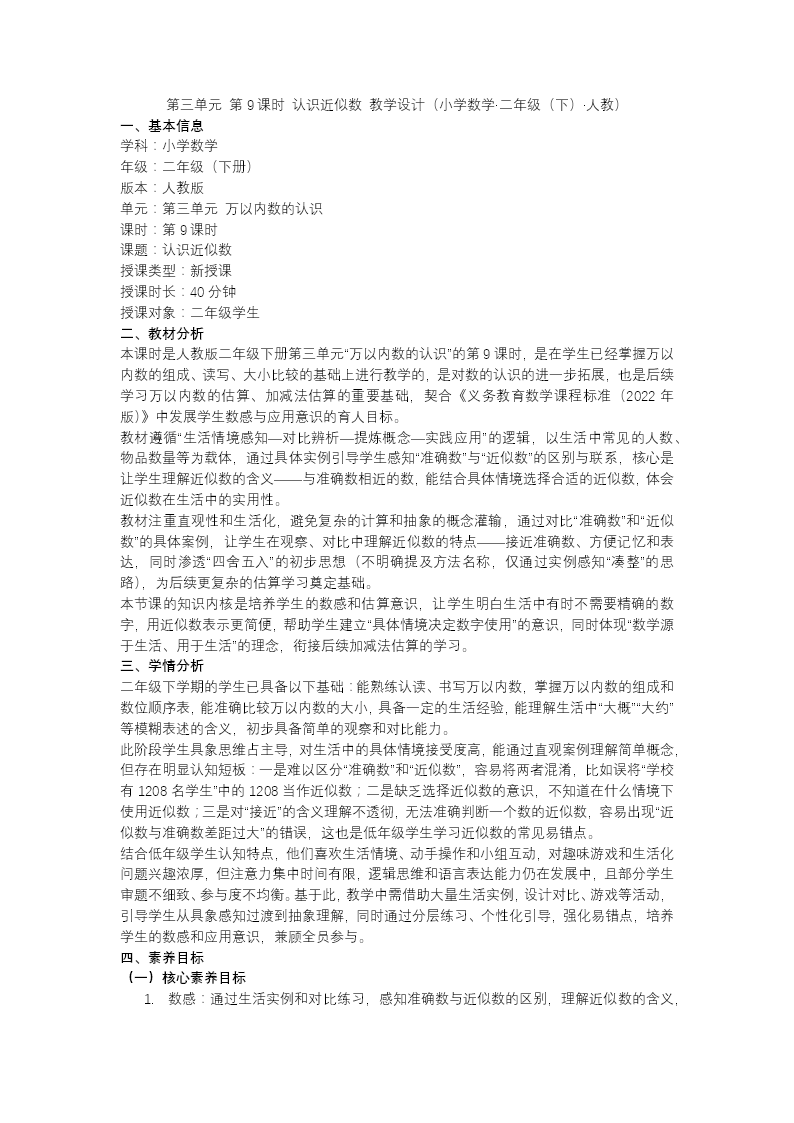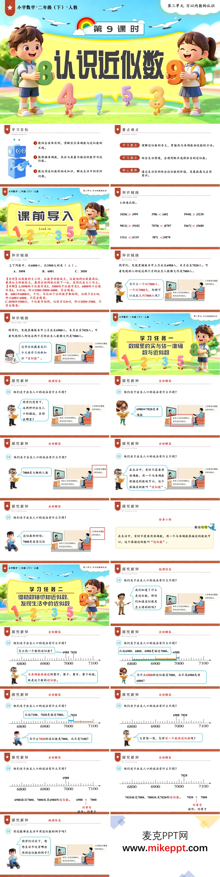 本课件为人教版二年级下册《认识近似数》教学设计,聚焦近似数的概念理解与估算应用。开篇明确学习目标与核心素养,课前通过数的大小比较与范围判断激活已有经验,再以出生人口数的生活数据引入准确数与近似数的区分。新课分两层推进:任务一结合生活实例,帮助学生理解近似数的含义,体会其在表达与沟通中的便捷价值;任务二借助数轴直观演示,引导学生发现"找与准确数最接近的整十、整百、整千数"的方法,掌握约等号的规范读写。巩固环节设置分层达标练习,涵盖数的估算与生活场景应用(如价格估算、人数统计)。课堂尾声系统梳理找近似数的步骤,引导学生绘制思维导图内化方法,并布置差异化课后作业。全程以真实数据为载体,将抽象的估算过程可视化,帮助低年级学生在数形结合中理解近似本质,发展数感与应用意识。