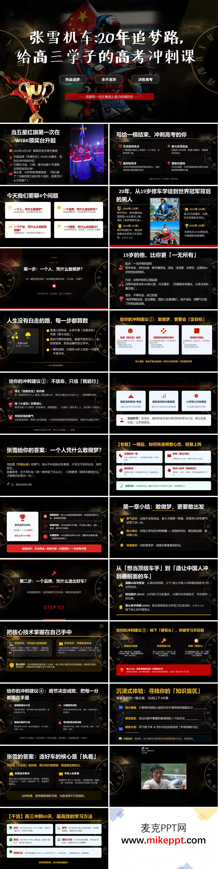 这套PPT以摩托车赛车手、企业家张雪二十年追梦奋斗的故事为主线,融合“致敬奋斗者”的励志主题与面向高三学子的“高考冲刺”指导,是一份鼓舞人心、方法务实的学习激励材料。其内容结构清晰,分为四个层层递进的章节,对应四个核心问题。第一部分聚焦“个人敢做梦”,通过张雪19岁从修车学徒起步、雨中追车求镜头的故事,激励学子勇敢锚定高考目标,并给出了制定具体、可量化目标与拆解任务等冲刺建议。第二部分围绕“品牌造好车”,以张雪创业后砸身家研发核心发动机的历程,类比学习中需“啃硬骨头”、突破瓶颈,并强调了抠细节、规范答题的重要性。第三部分延伸至“产业追赶超越”,借中国摩托车产业的整体崛起,阐释“长期主义”与“死磕精神”,指导学子制定打卡计划、度过学习高原期。最后一部分升华至“国家走向复兴”,将个人高考奋斗与中国梦、国家发展需求相结合,鼓励学子立大志、担大任。整体设计上,PPT图文并茂,使用了张雪本人的历史照片、赛道影像、数据图表以及“热血追梦”等激励性标语。每一部分都紧密融合张雪的人生节点与给高三学子的具体冲刺建议、互动练习及真实逆袭案例,使榜样故事与实战方法论有机结合,旨在为学子提供精神动力与可操作的行动指南。