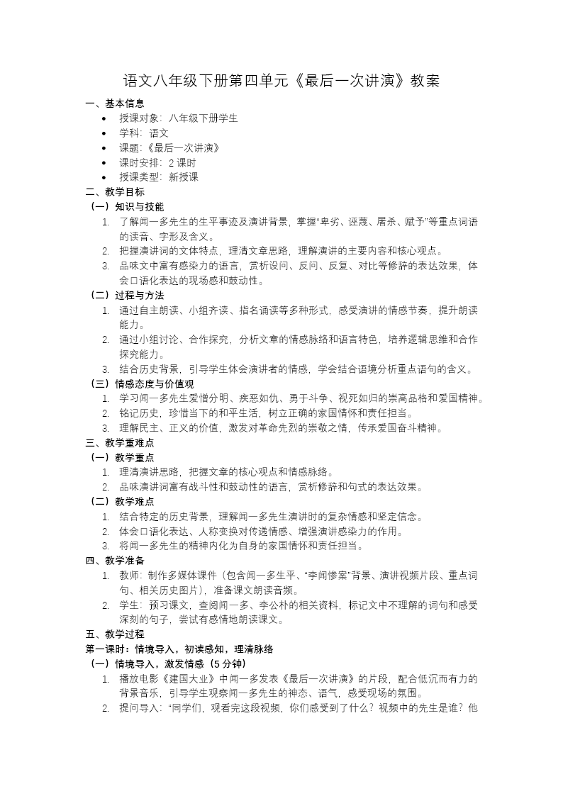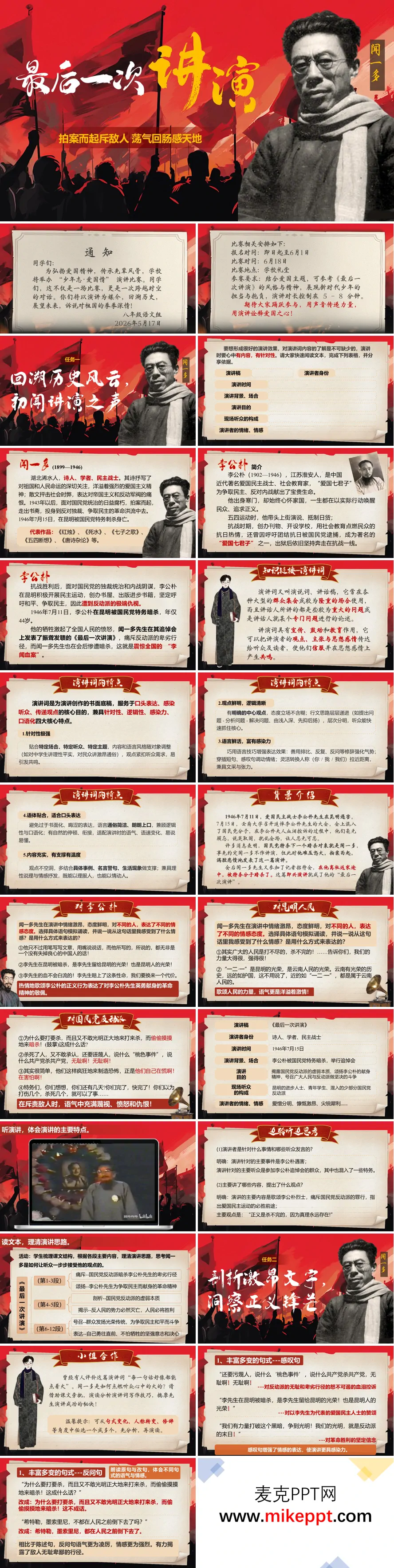 这是八年级下册《最后一次讲演》教学课件,共42页,以闻一多先生演讲为核心,采用红色主题风格,还原气壮山河的演讲场景。以"少年志·爱国情"演讲比赛任务导入,先介绍闻一多、李公朴的生平与演讲背景,讲解演讲词针对性、感染力等核心特点。接着引导学生梳理演讲思路,分析闻一多对不同对象的情感态度,再通过小组合作,解析感叹句、反问句、人称变换等语言技巧,感受其强大的现场感染力。课堂还设计配音、模拟演讲的实践环节,帮助学生体会演讲的节奏与情感,最后拓展爱国主题诗句,升华主题。整套课件兼顾文本解读、语言赏析与实践体验,既落实了语文知识,也传递了爱国精神。