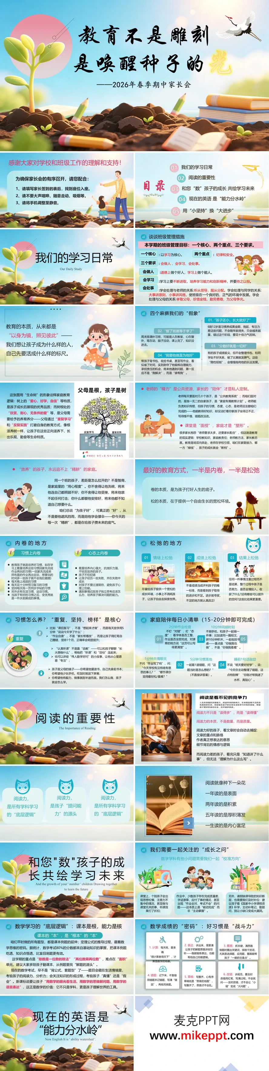 这套PPT的标题是“教育不是雕刻是唤醒种子的光”,副标题为“2026年春季期中家长会”。其内容聚焦于家校合作,以培养孩子为核心,结构清晰,图文并茂。PPT开篇强调了教育的“唤醒”本质,并明确了家长会的注意事项。主体内容分为五个主要章节:1.我们的学习日常:阐述了班级管理的“一个核心、两个重点、三个要求”,即“以学习为核心”、“纪律和安全”以及“会做人、会学习、会处事”。强调了身教重于言传,并指出了“孩子还小长大就好”等四个可能麻痹家长的教育“假象”。2.阅读的重要性:将阅读定义为“看不见的竞争力”,指出阅读力的核心在于理解质量而非数量,是所有学科学习的“底层逻辑”,并比喻阅读如同种花,需要长期积累才能内心富足。3.和您“数”孩子的成长:专注于数学学习,指出课本是根本,强调计算、表达、圈画关键词、整理错题、规范草稿和及时改错等六大学习习惯的重要性。4.现在的英语是“能力分水岭”:分析了英语学习进入关键爬坡期的现状,将学生的学习状态分为“认真自觉型”、“普通中等型”和“落后马虎型”三类,并指出学好英语需要抓牢“词汇”、“听读”和“课堂与作业”三个基本盘。5.用“小坚持”换“大进步”:提供了具体的家庭陪伴行动指南,如“每日小清单”,包括2分钟作业检查、1分钟共情聊天、5分钟习惯落地等可操作的短时互动建议,倡导“精耕”式的家庭教育和“一半内卷,一半松弛”的教育智慧。整套PPT通过“生命树”等形象比喻和对比分析,生动传达了家校共育、习惯养成、能力培养和长期陪伴的核心教育理念,旨在引导家长从态度到行动上进行配合,共同促进孩子的全面发展。