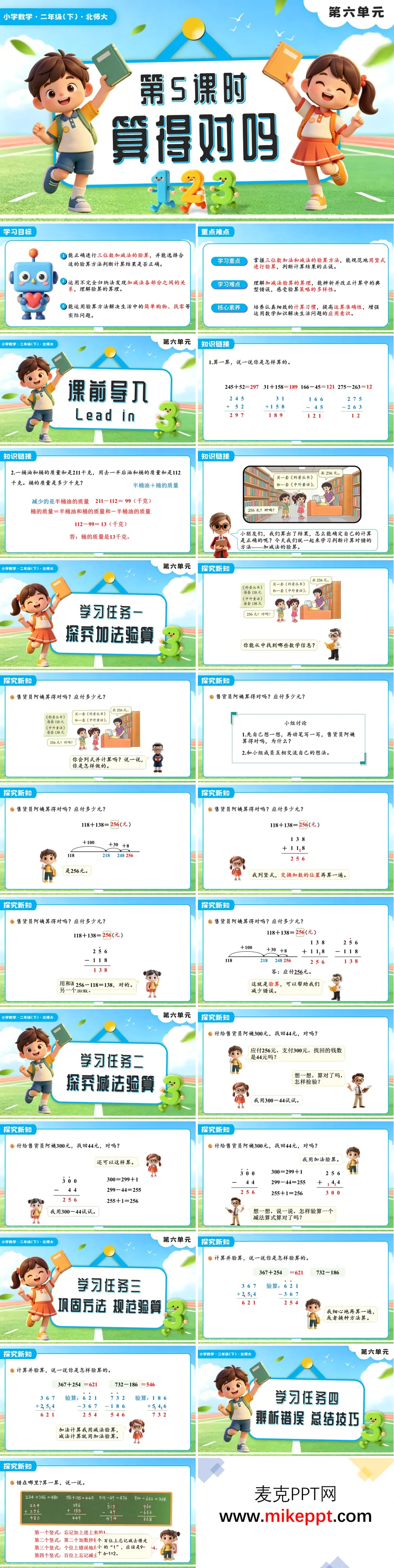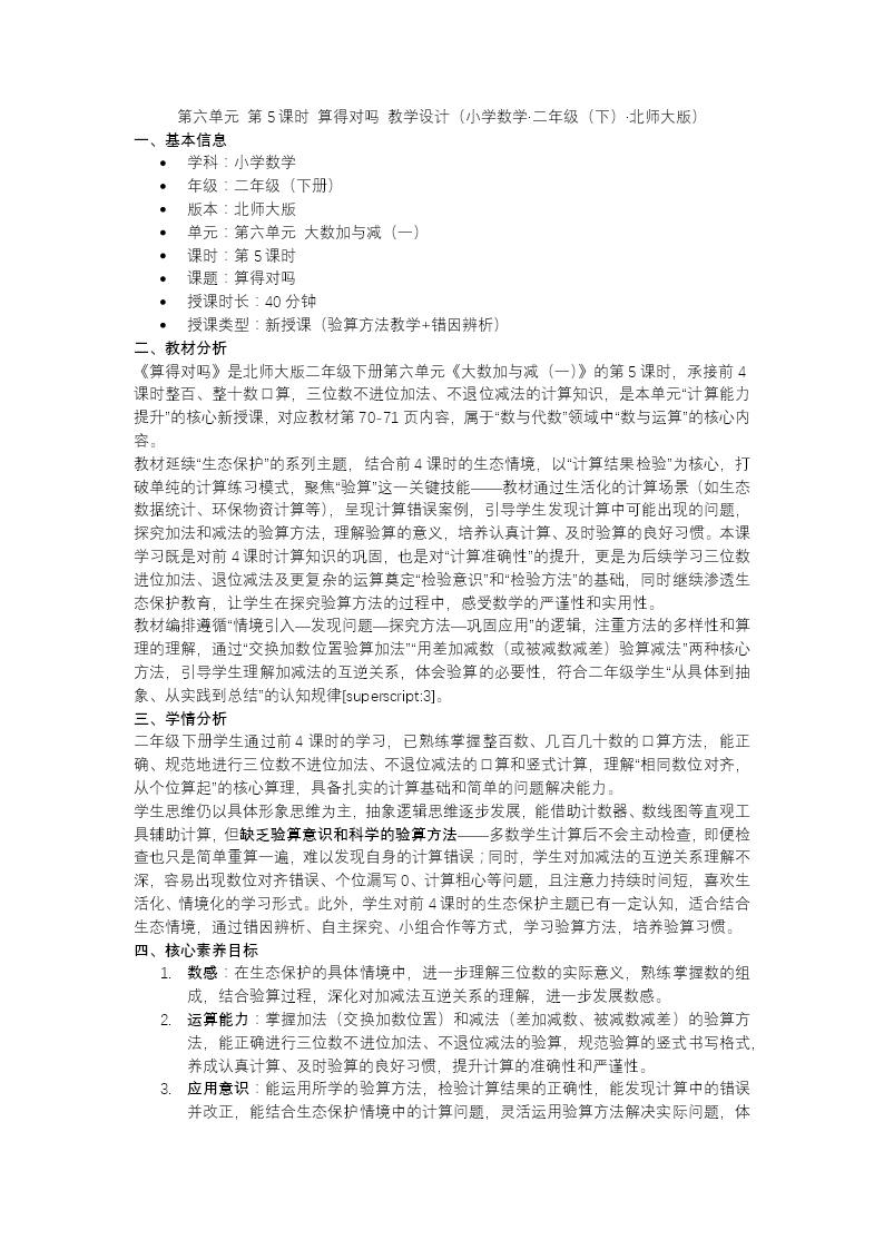 本课时为北师大版二年级下册数学第六单元《算得对吗》第5课时,聚焦"三位数加减法验算"。课前通过基础计算与实际问题复习做好认知铺垫;课中以购物情境为载体,引导学生探究加法验算的两种路径——交换加数位置再算一遍,或用和减去一个加数看是否等于另一个加数;同时掌握减法验算的两种方法,即差加减数是否等于被减数、被减数减差是否等于减数。过程中穿插易错点辨析,帮助学生总结规避计算失误的策略。巩固环节设置卡片收集、竖式验算、森林医生等多样化练习,指导学生规范验算步骤,逐步养成自觉检查的良好习惯。课后安排思维导图绘制与分层作业,促使学生内化验算方法,切实提高计算准确率及解决实际问题的能力。