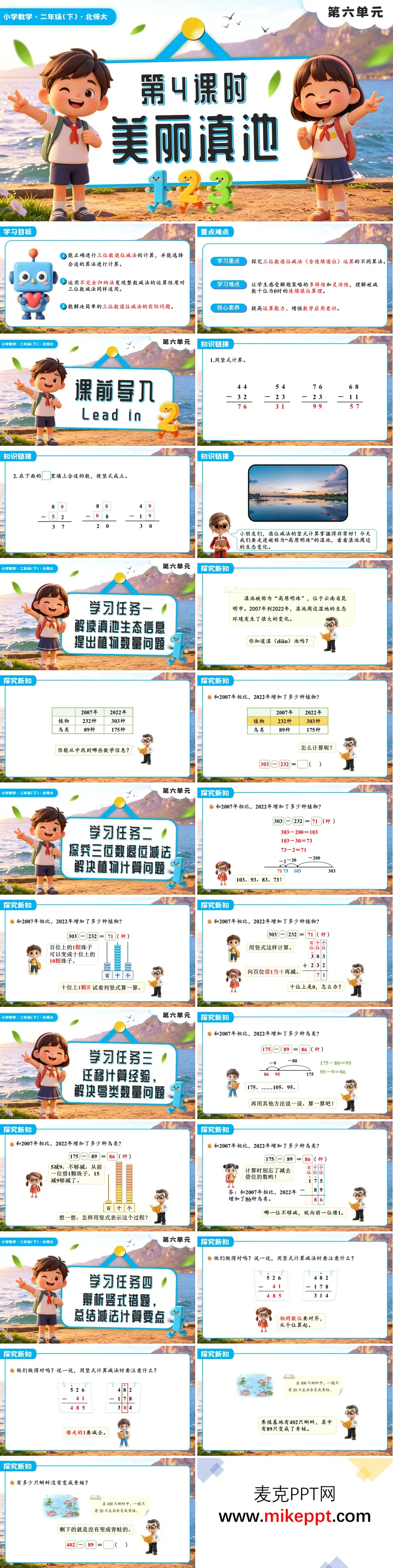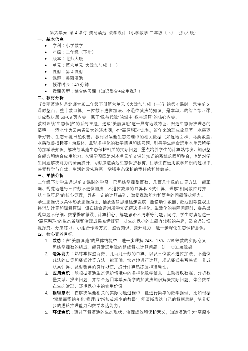 本课时为北师大版二年级下册数学第六单元《美丽滇池》第4课时,以滇池生态数据为真实情境贯穿全课。课前通过退位减法基础计算复习激活已有经验;课中引导学生探究三位数退位减法(含连续退位)的多种算法,借助计数器直观演示与拆分法算理分析,帮助学生深入理解"借一当十"的退位原理。结合典型错例辨析竖式计算中的易错点,归纳总结计算要点与规范步骤。巩固环节设计"画一画"、实际问题解决、竖式计算等分层练习,引导学生在具体情境中熟练运用退位减法。课后布置思维导图绘制与弹性作业,助力学生建构知识体系,切实提升计算准确性及运用数学解决生态问题的应用意识。