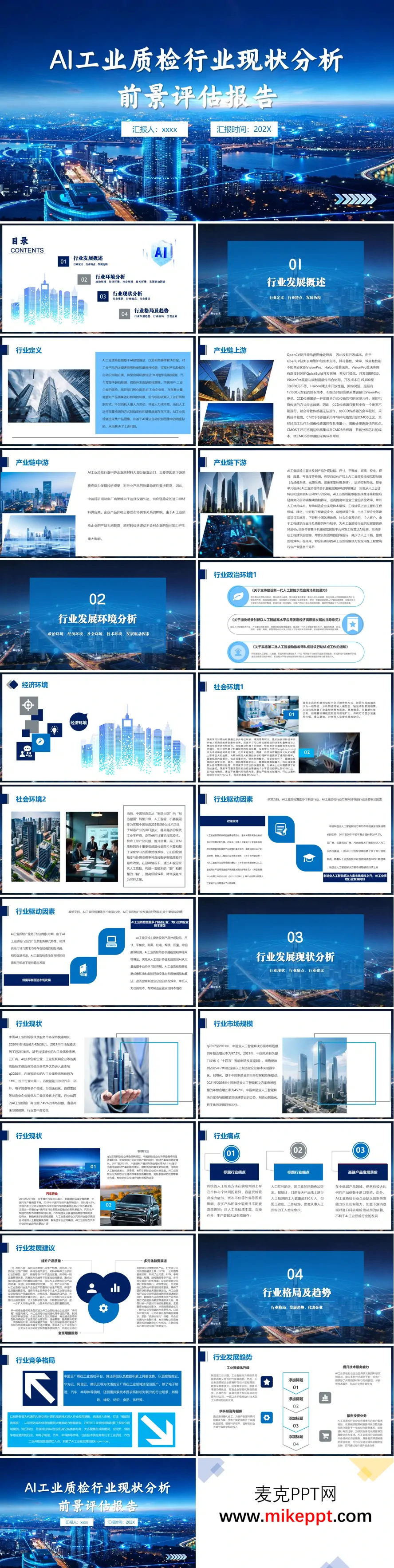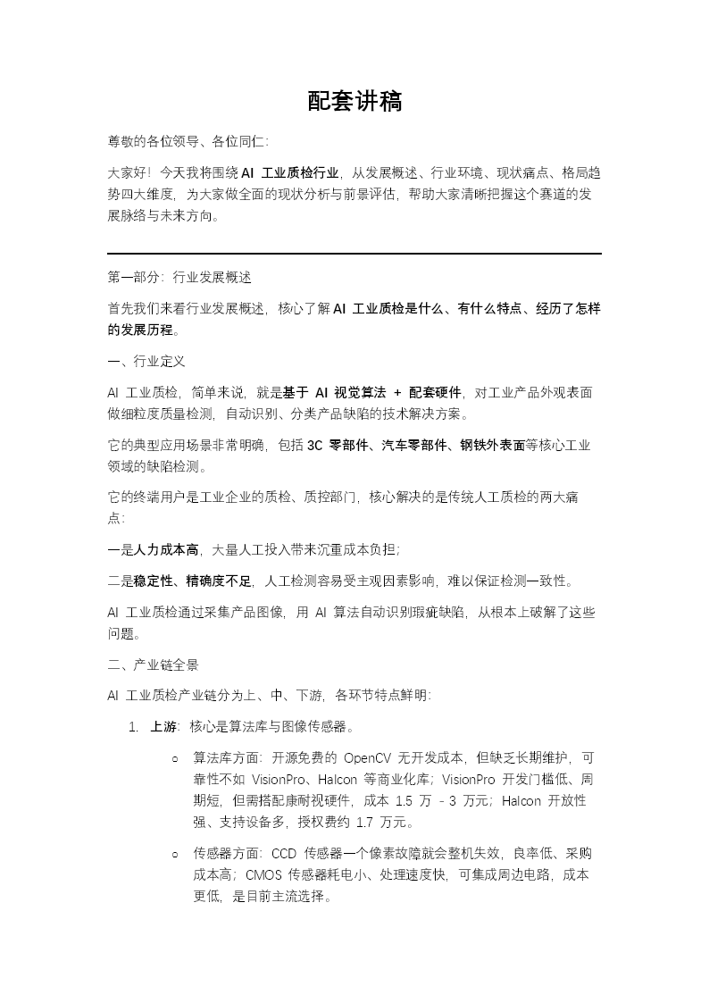 这份名为“AI工业质检行业现状分析前景评估报告”PPT,系统性地分析了中国AI工业质检行业。报告首先对行业进行了定义,指出AI工业质检是基于AI视觉算法和相关硬件,对工业产品(如3C、汽车零部件、钢材)进行自动缺陷识别与分类的技术,旨在解决传统人工质检成本高、稳定性差、精度不足的痛点。接着,报告梳理了产业链,对比了上游的OpenCV、VisionPro、Halcon等算法库及CCD/CMOS传感器,分析了中游企业的进口依赖特性,并详述了下游在尺寸、外观、平整度等多维度的检测应用,特别是在工程建筑等新兴领域的拓展潜力。报告重点分析了行业的发展环境。在政治环境方面,国家出台了多项政策(如《关于支持建设新一代人工智能示范应用场景的通知》)鼓励人工智能应用场景创新,为行业发展提供了强力支持。社会环境方面,中国制造向“制造强国”转型,传统机器视觉的局限性推动了AI视觉技术的落地需求。技术环境则强调了从人工规则到AI自动学习的突破。核心驱动因素包括政策扶持、市场规模快速增长(2017-2021年CAGR达97.2%)、以及为企业带来的降本增效价值。在现状与格局部分,报告指出中国AI工业质检市场增长迅速,2021年市场规模接近2亿美元,但行业集中度较低(2020年前四厂商占45%),百度智能云以16%的份额位居第一。报告列举了该技术在汽车和钢铁两个重要行业的应用现状与需求。同时,报告揭示了三大行业痛点:人工质检效率低成本高、人口红利消失导致用工难、以及高端产品对外依赖度高。针对这些痛点,报告提出了提升产品质量、发展全面增值服务和拓展多元化融资渠道等发展建议。最后,报告展望了行业格局与趋势。参与竞争的厂商主要包括百度、华为、阿里、腾讯等云厂商(覆盖场景广)和以创新奇智、阿丘科技、思谋科技为代表的AI创企(深耕细分领域)。未来发展趋势将围绕工业智能化升级、提升技术服务能力、聚焦投资业务等方面展开。