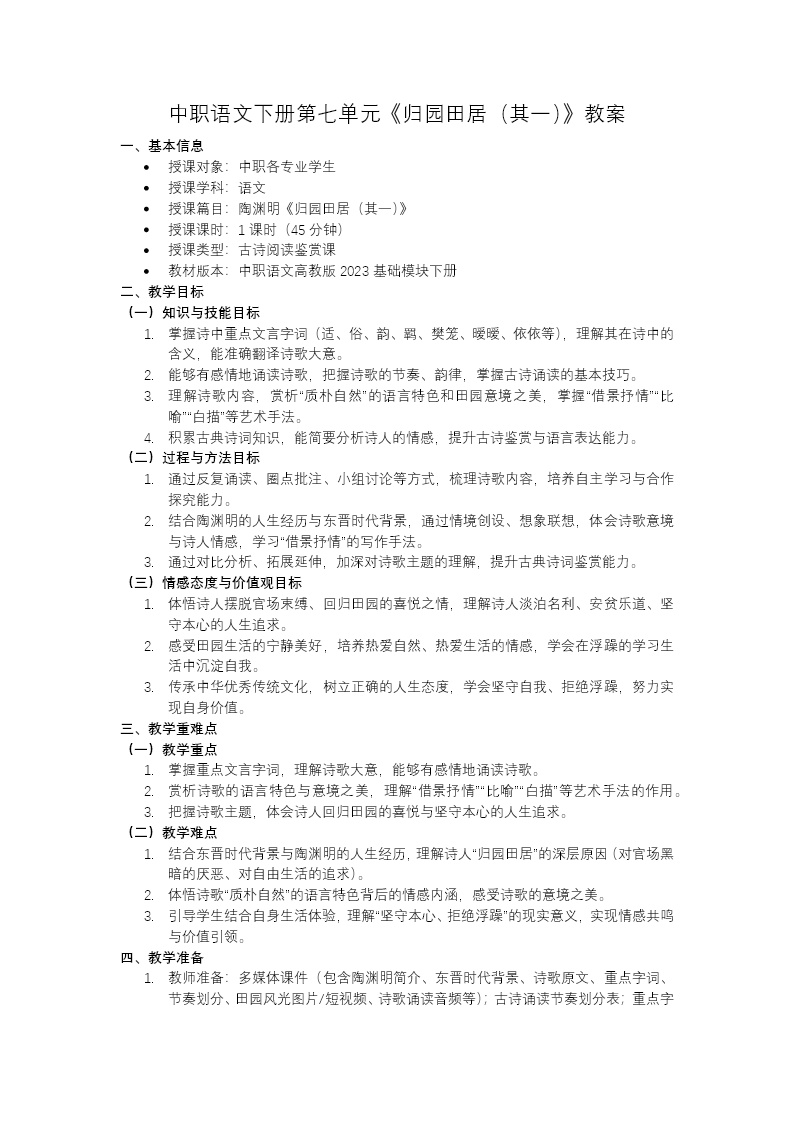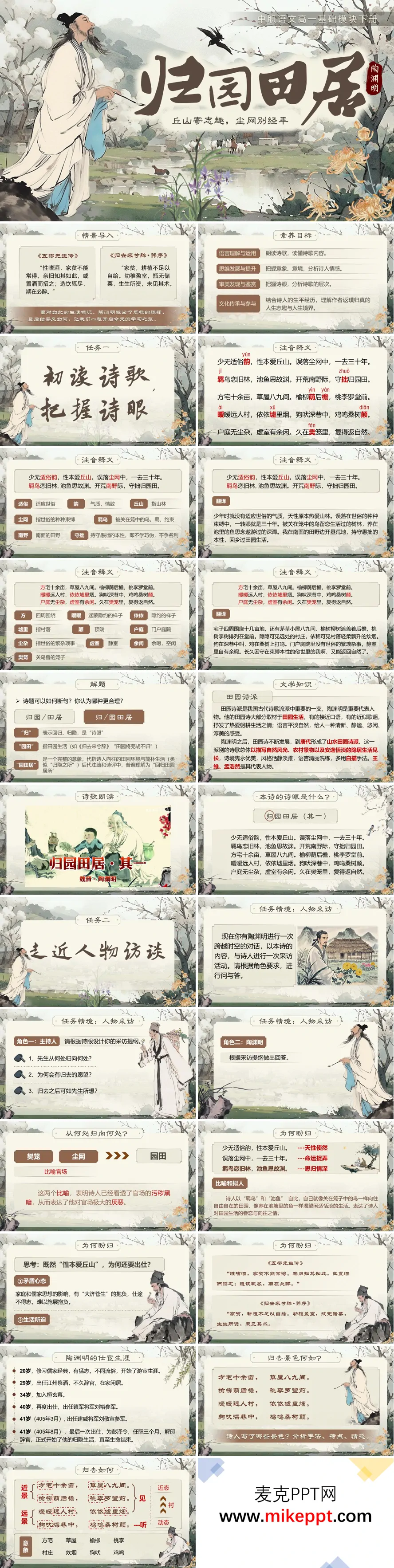 这是中职语文《归园田居(其一)》教学课件,共42页,采用清雅古风设计,完整覆盖田园诗教学全流程。内容从情景导入、素养目标切入,先完成注音释义、解题、诗眼梳理等基础教学,再以"人物访谈"为情境,引导学生探究陶渊明归园田居的动因、仕宦经历与田园生活图景,重点解析白描手法、意象与情感,串联诗人厌弃官场、向往自然的心境变化。同时补充田园诗派背景、隐逸文化拓展,设置当堂检测与对比阅读作业,兼顾基础落实与文化思辨,帮助学生理解陶渊明返璞归真的人生志趣,兼具知识性与审美性,适配中职语文古诗文教学需求。